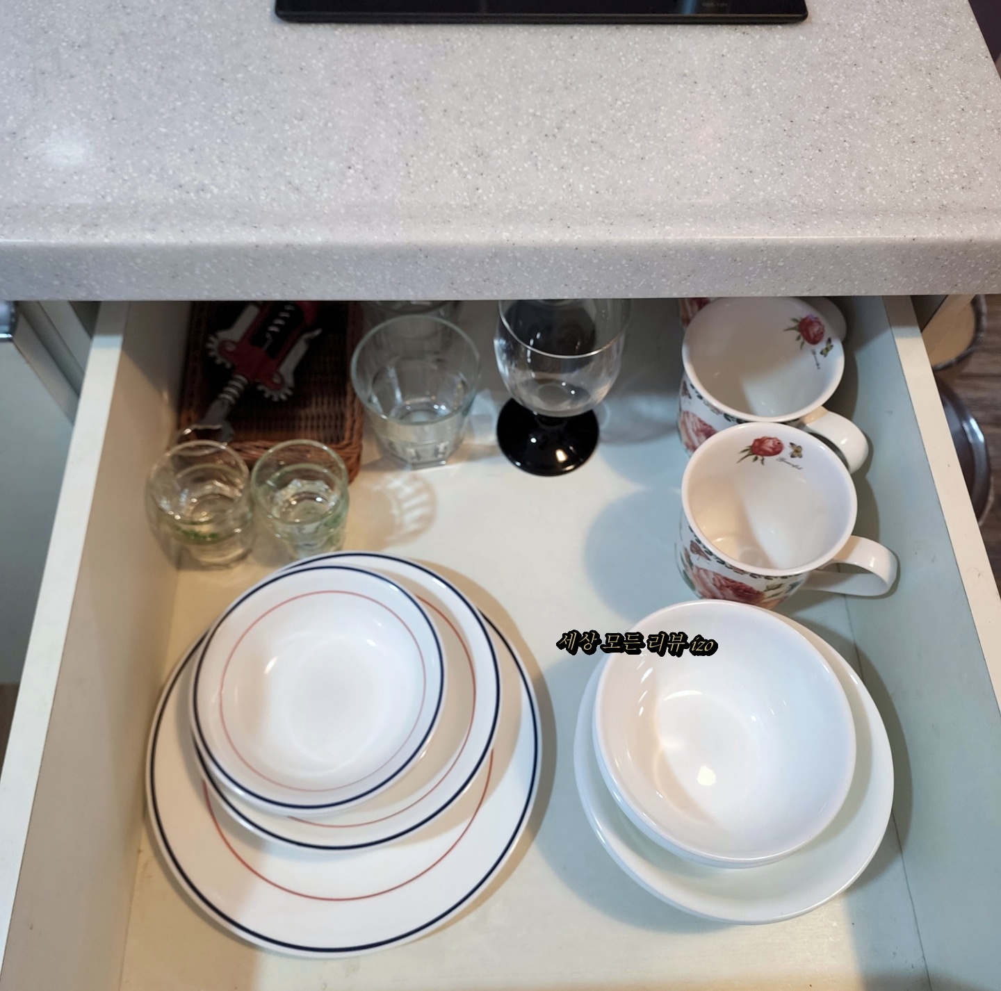 주방에는 각종 식기류가 다 준비되어 있습니다. 저희는 와인을 사 갔었는데 와인잔과 와인 오프너도 준비되어 있더라고요. 전기밥통과 각종 프라이팬, 등이 다 준비되어 있어요. 전자레인지는 가운데 건물 카페에 있어서 사용할 수 있어요. 카페에는 덜어가서 사용하라고 각종 조미료가 준비되어 있더라고요.