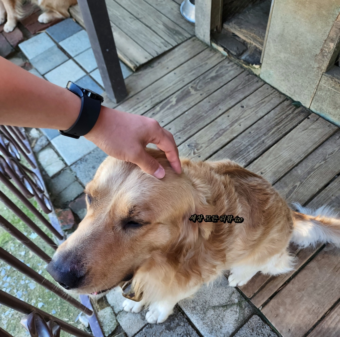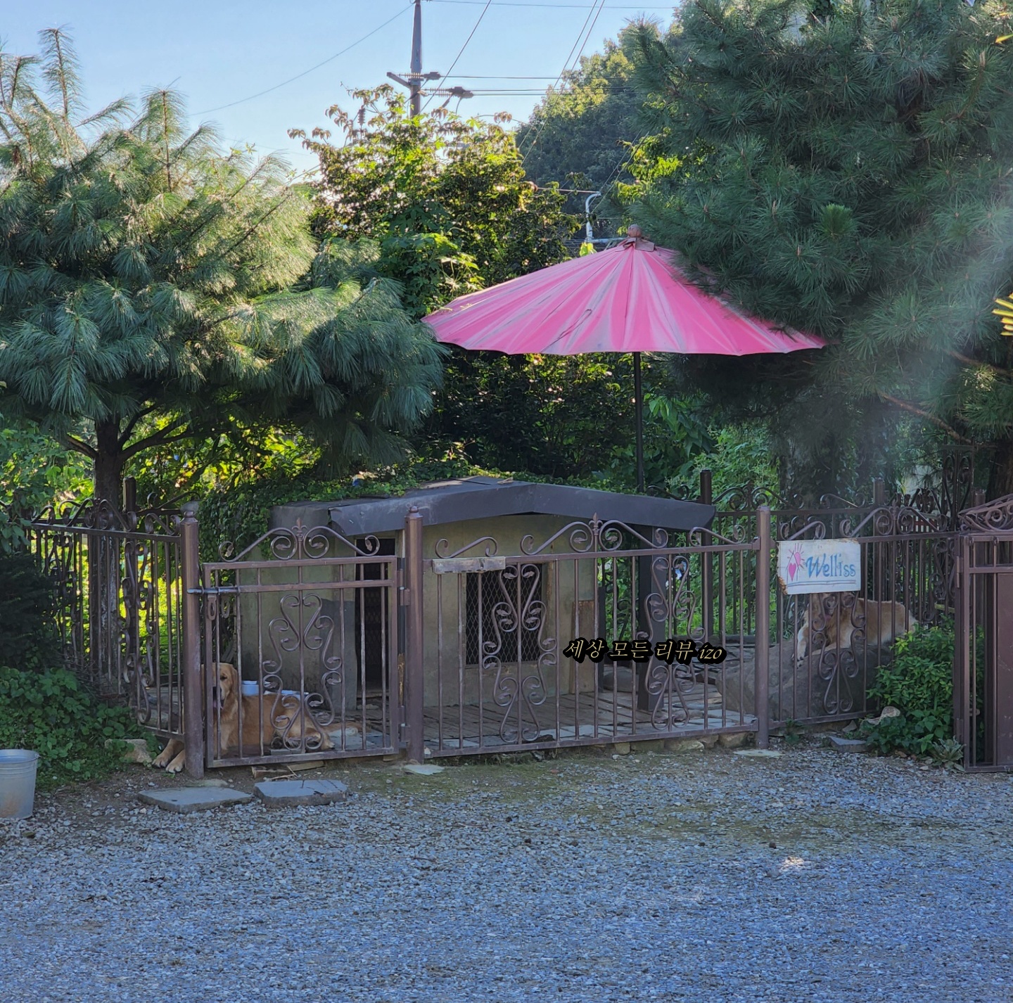 캐리비안베이에서 놀이기구 한 개 타고 사진 좀 찍고 바로 용인 웰리스 펜션으로 갔습니다. 에버랜드에서 20분 정도 가면 도착하는 용인 에버랜드 펜션으로 정말 가까워요. 날씨도 정말 좋아서 하늘이 너무 예뻤어요. 예쁜 하늘을 보면서 가다 보면 금방 웰리스 펜션에 도착합니다. 펜션에 도착하면 예쁜 댕댕이들이 우리를 반겨줍니다. 2년 전 애기들과 너무 재미있게 놀아서 다시 방문했습니다. 펜션이 정말 예쁘지만 그래도 골든 레트리버 아이들이 먼저 눈에 들어옵니다.