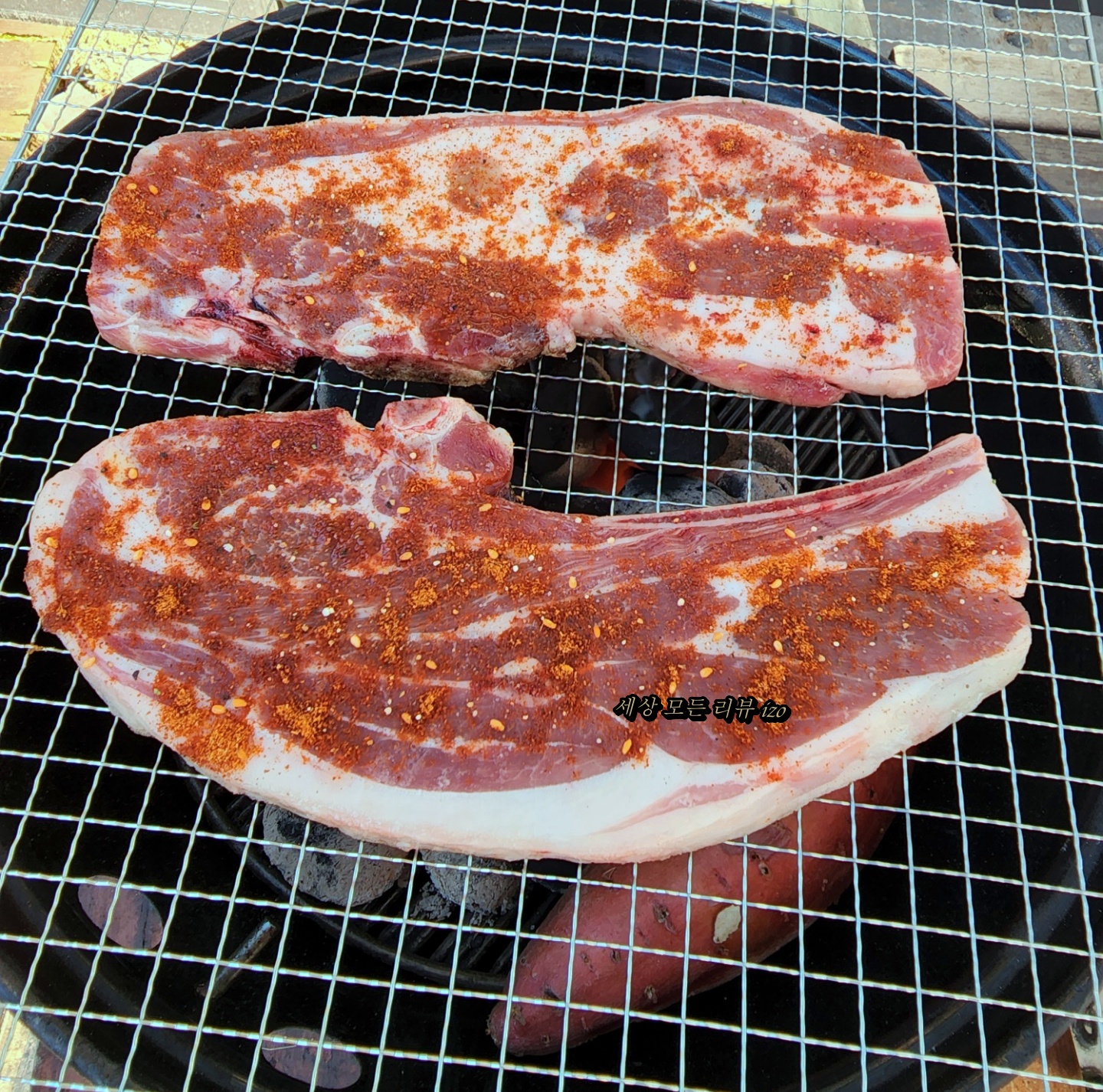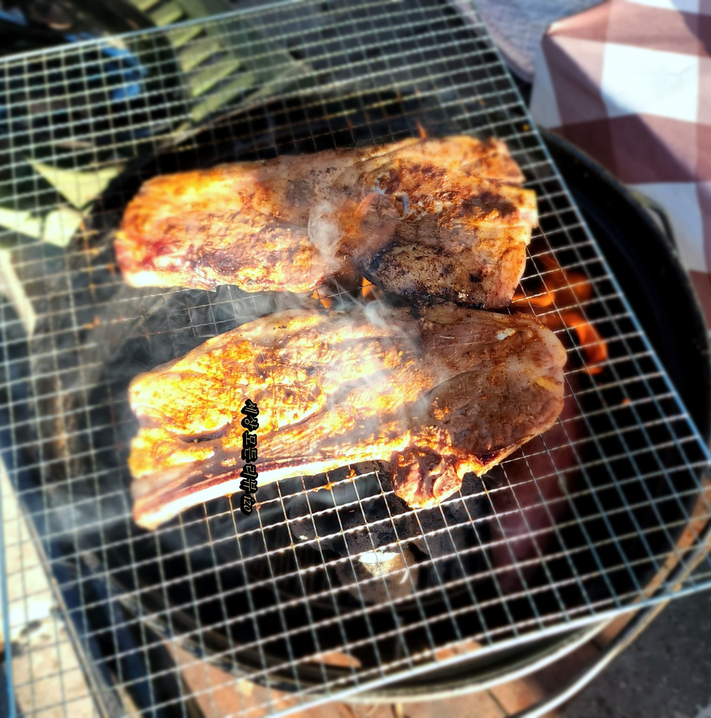 고기는 다양하게 준비해 갔어요. 집에서 미리 쿠팡 로켓 프레시로 구매해서 아이스박스에 넣어서 왔습니다. 로켓 프레시에서 구매하면 저렴하게 구매할 수 있어서 좋은 것 같아요. 일단 1차로 토마호크 양고기를 먹었습니다. 숯불에 구워서 기름이 쫙 빠지고 불향이 입혀져서 너무 맛있더라고요. 토마호크 양갈비