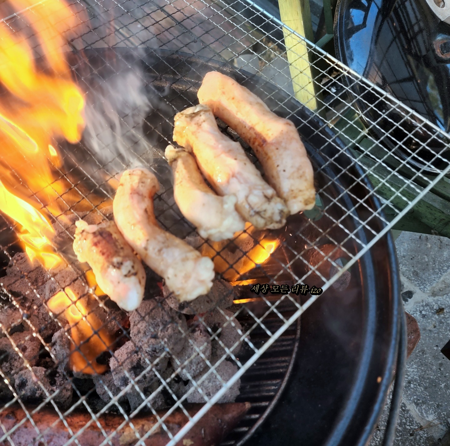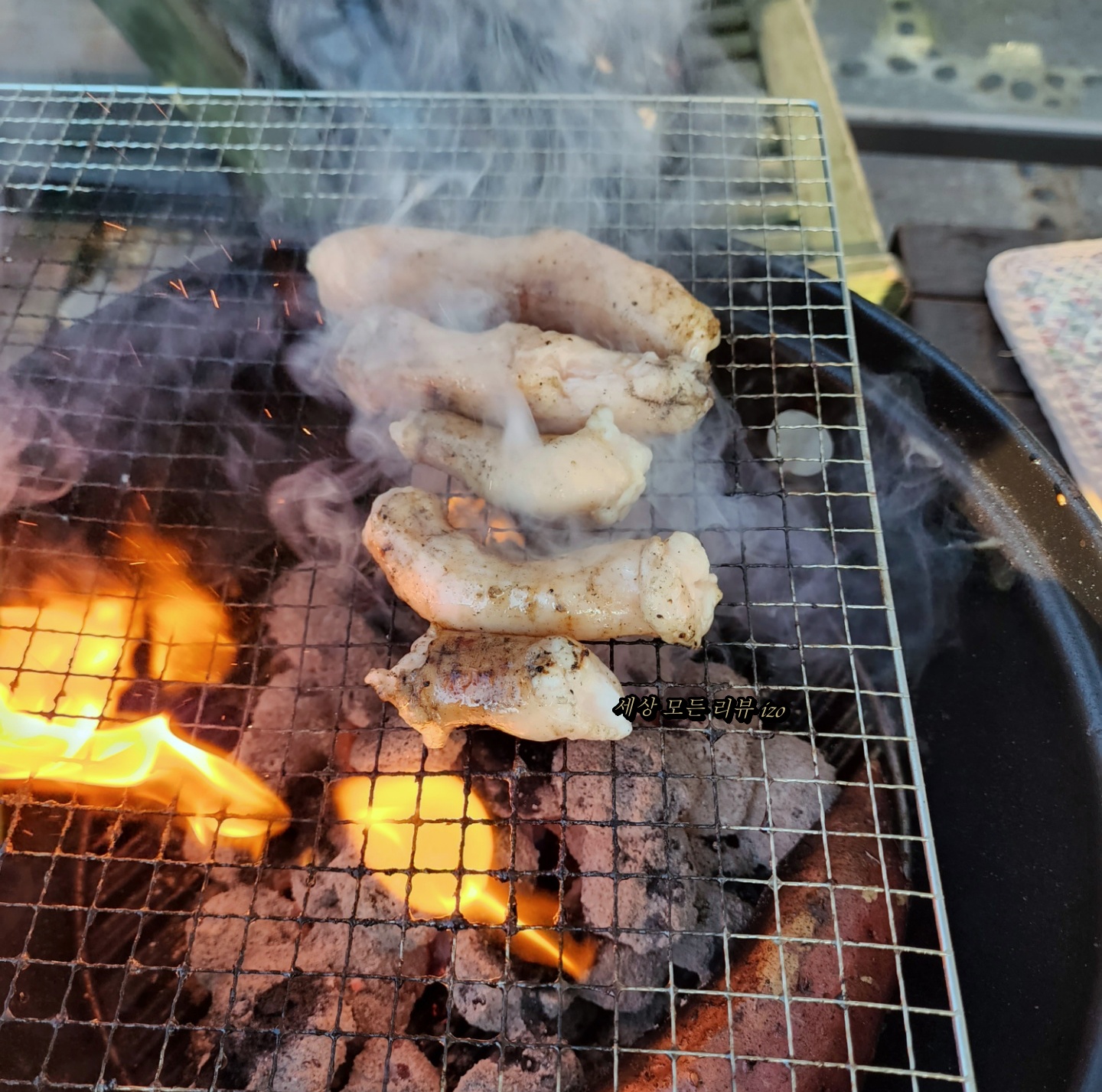 불이 줄어들으면 이제 여자 친구가 먹고 싶어 하던 양대창을 올려줍니다. 양대창을 며칠 전부터 먹고 싶다고 해서 함께 구매해 갔는데 숯불에 구워 먹으니 너무 맛있었어요. 숯불에 양대창을 구우니까 기름이 너무 빠져서 굽기가 어렵긴 했는데 그래도 정말 맛있더라고요. 곱을 충분히 즐기려면 숯불보다는 팬이 좋은 것 같기도 하더라고요. 양대창 구매 링크