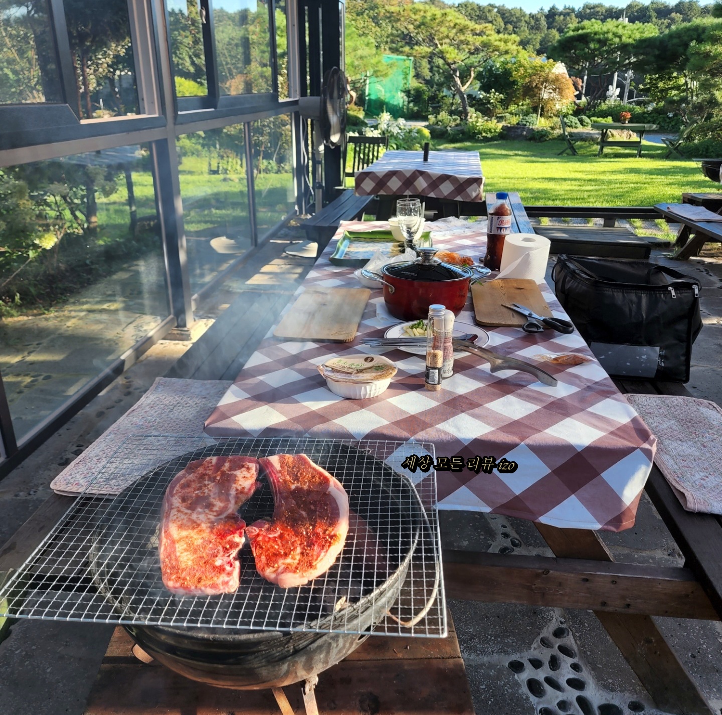 예쁜 정원에서 조금 덥지만 이렇게 구워 먹으니까 좋더라고요. 그런데 파리가 조금 있어서 불편하긴 했어요.