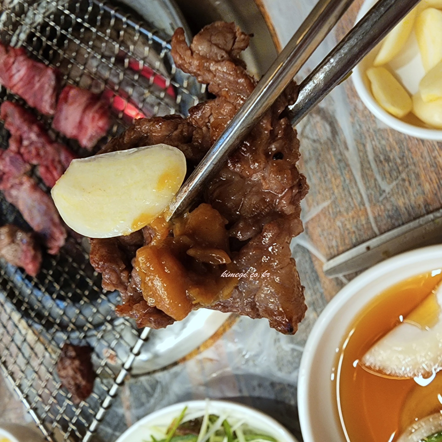 불도 좋고 고기도 좋아서 정말 맛있게 고기를 구울 수 있었어요. 불이 너무 세지 않아서 소고기를 굽기에 딱이었습니다. 부드럽게 먹을 수 있게 칼집도 잘 들어가 있고 적당히 기름기도 있어서 입에서 살살 녹았어요.