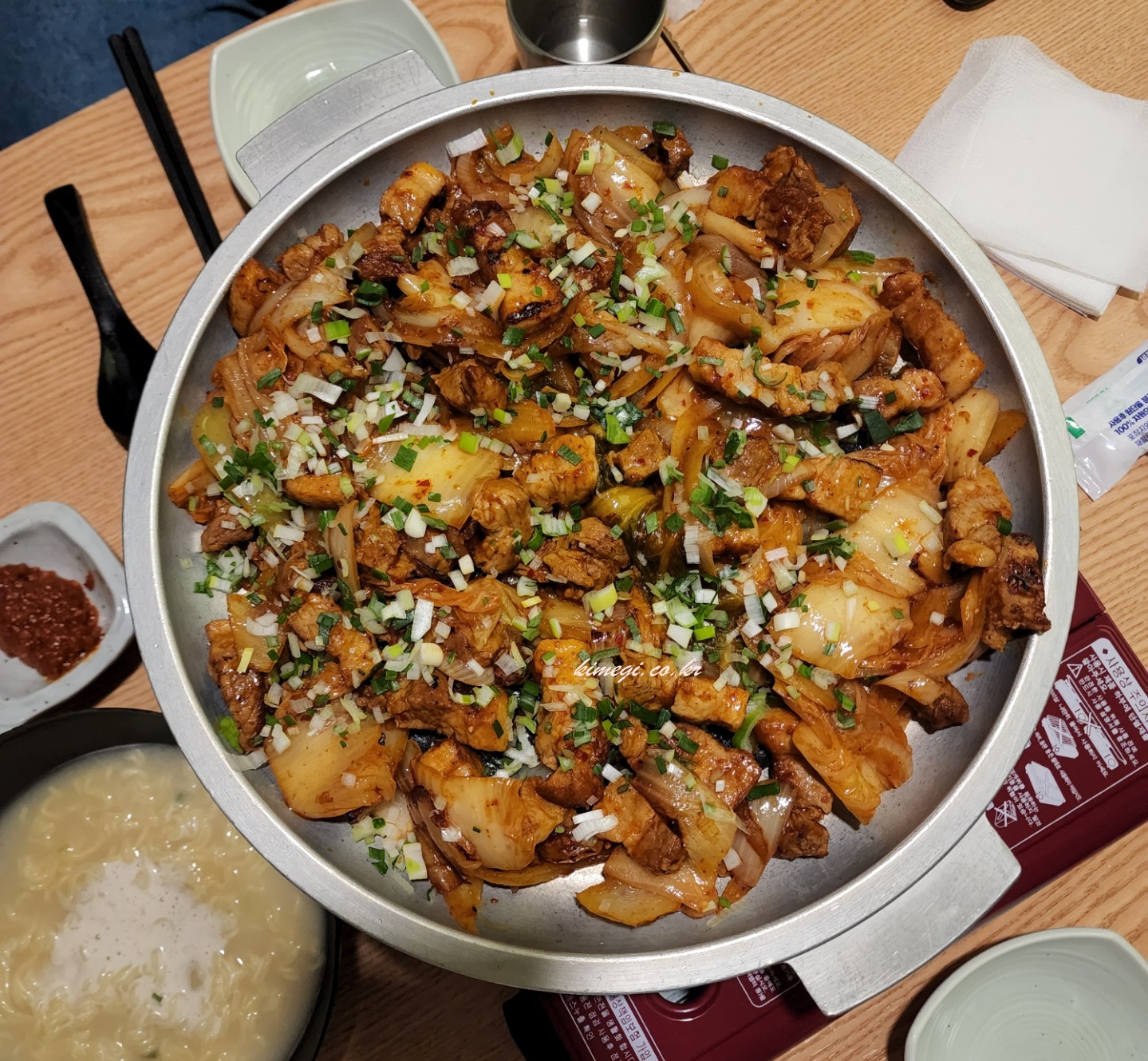 사골 라면을 끓이고 있으면 삼겹살 김치볶음이 나옵니다. 버너로 데워주면서 먹으면 됩니다. 이미 다 조리가 되어서 나오기 때문에 바로 먹을 수 있습니다.