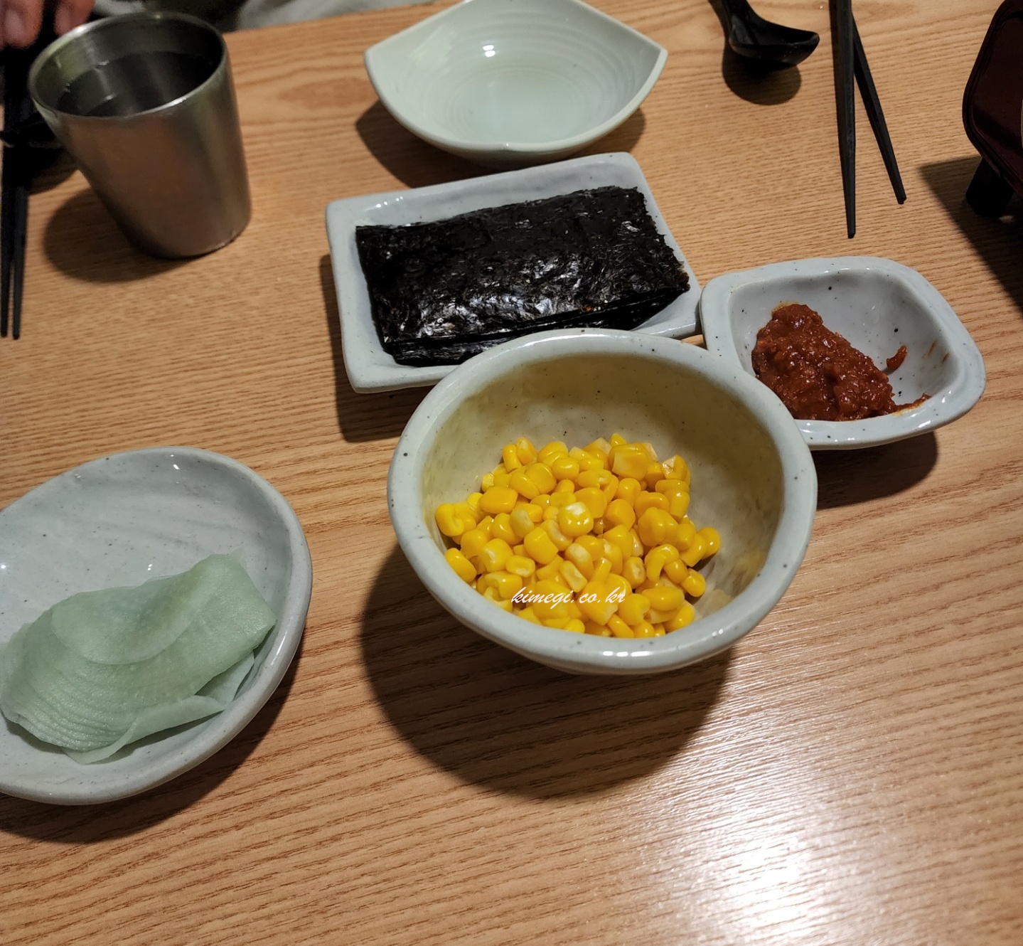 일단 먼저 사골 라면을 먼저 줍니다. 사골곰탕 라면이에요. 밑반찬은 조미 안된 김과 옥수수, 무쌈이 나와요. 삼겹살 김치볶음과 아주 잘 어울리는 밑반찬 들입니다.