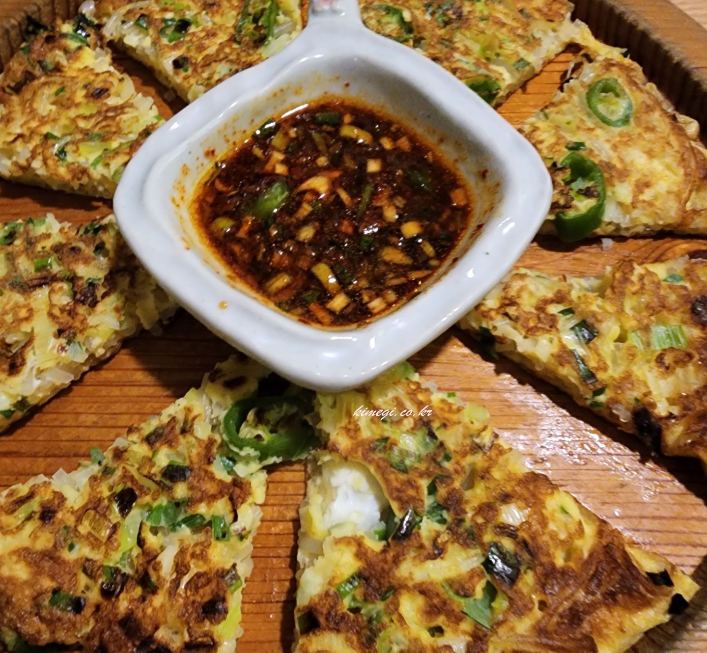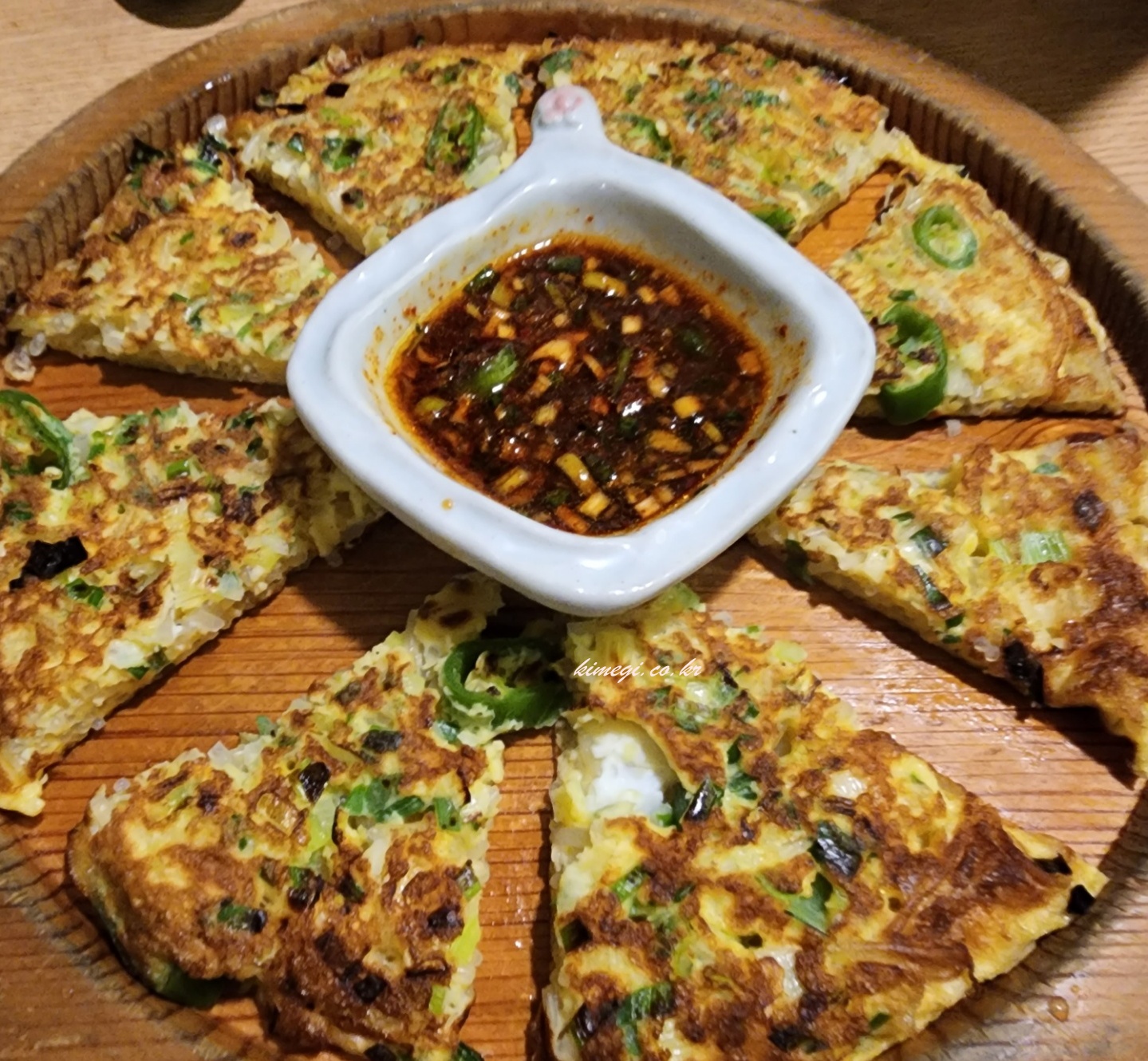 사이드 메뉴로 계란 당면을 주문했어요. 피자처럼 잘라서 나오는데 묘한 맛이에요. 계란에 당면이 들은 맛인데 간장을 찍어서 먹으면 묘하게 맛있습니다. 자극적인 돼지김치볶음을 올려 먹어도 맛있더라고요. 홀짝집에 계란당면을 먹으러 오는 사람들도 많다고 해요.