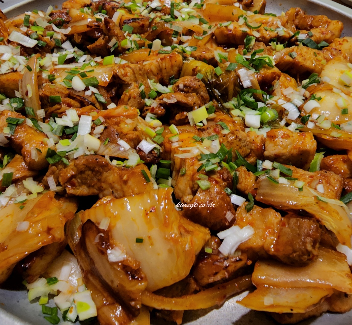 돼지고기 김치 볶음이 먼저 나왔습니다. 2인분인데 양이 진짜 많아요. 가격도 9500원으로 아주 저렴하고 맛있습니다. 사실 돼지고기와 김치를 볶으면 안 맛있을 수가 없습니다. 우리가 아는 그 돼지김치볶음 맛인데 아주 저렴하고 푸짐해서 좋은 것 같아요.