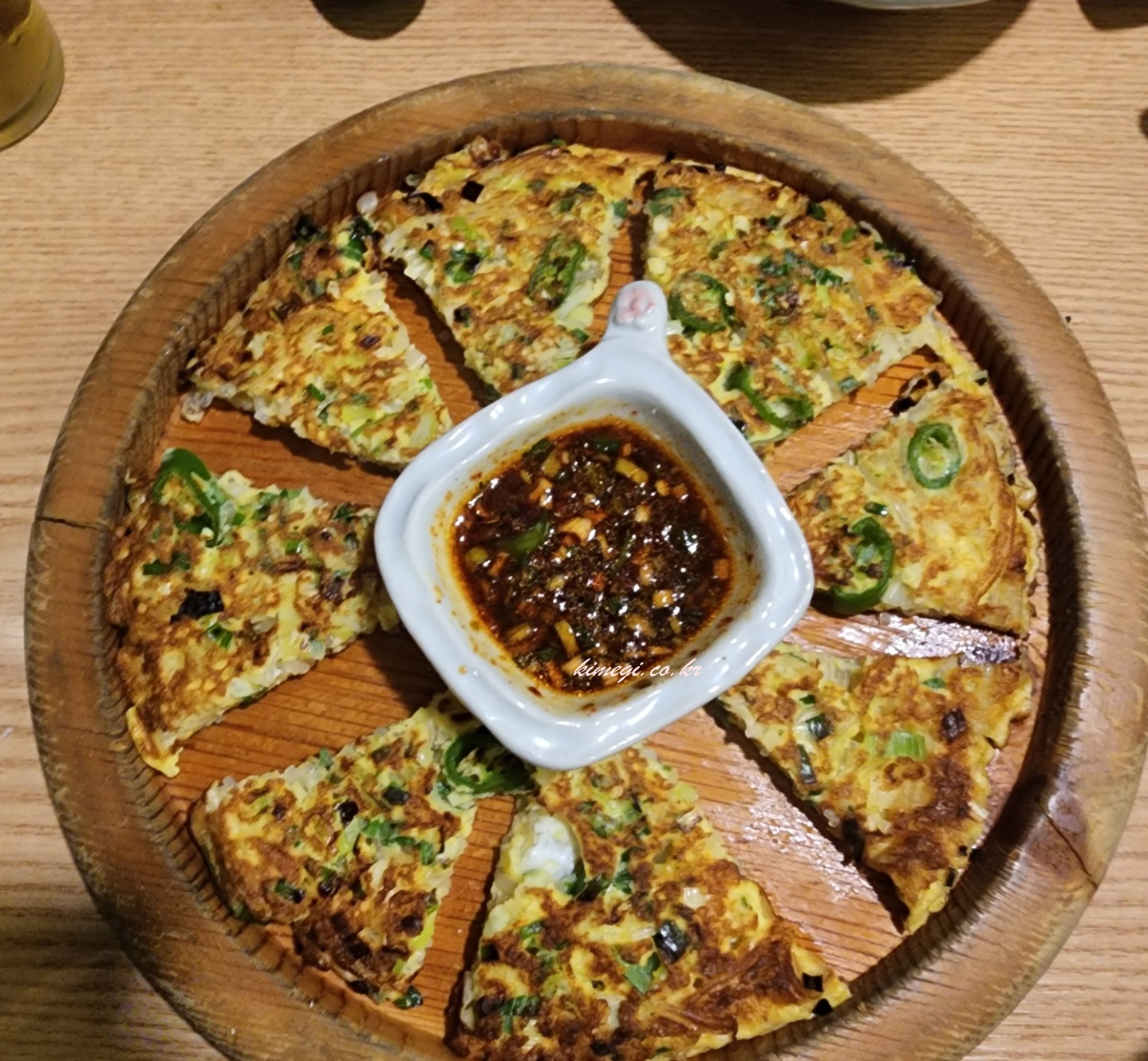 사이드 메뉴로 계란 당면을 주문했어요. 피자처럼 잘라서 나오는데 묘한 맛이에요. 계란에 당면이 들은 맛인데 간장을 찍어서 먹으면 묘하게 맛있습니다. 자극적인 돼지김치볶음을 올려 먹어도 맛있더라고요. 홀짝집에 계란당면을 먹으러 오는 사람들도 많다고 해요.