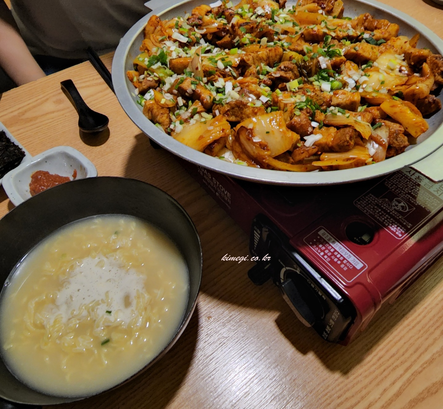 사골 라면을 끓이고 있으면 삼겹살 김치볶음이 나옵니다. 버너로 데워주면서 먹으면 됩니다. 이미 다 조리가 되어서 나오기 때문에 바로 먹을 수 있습니다.