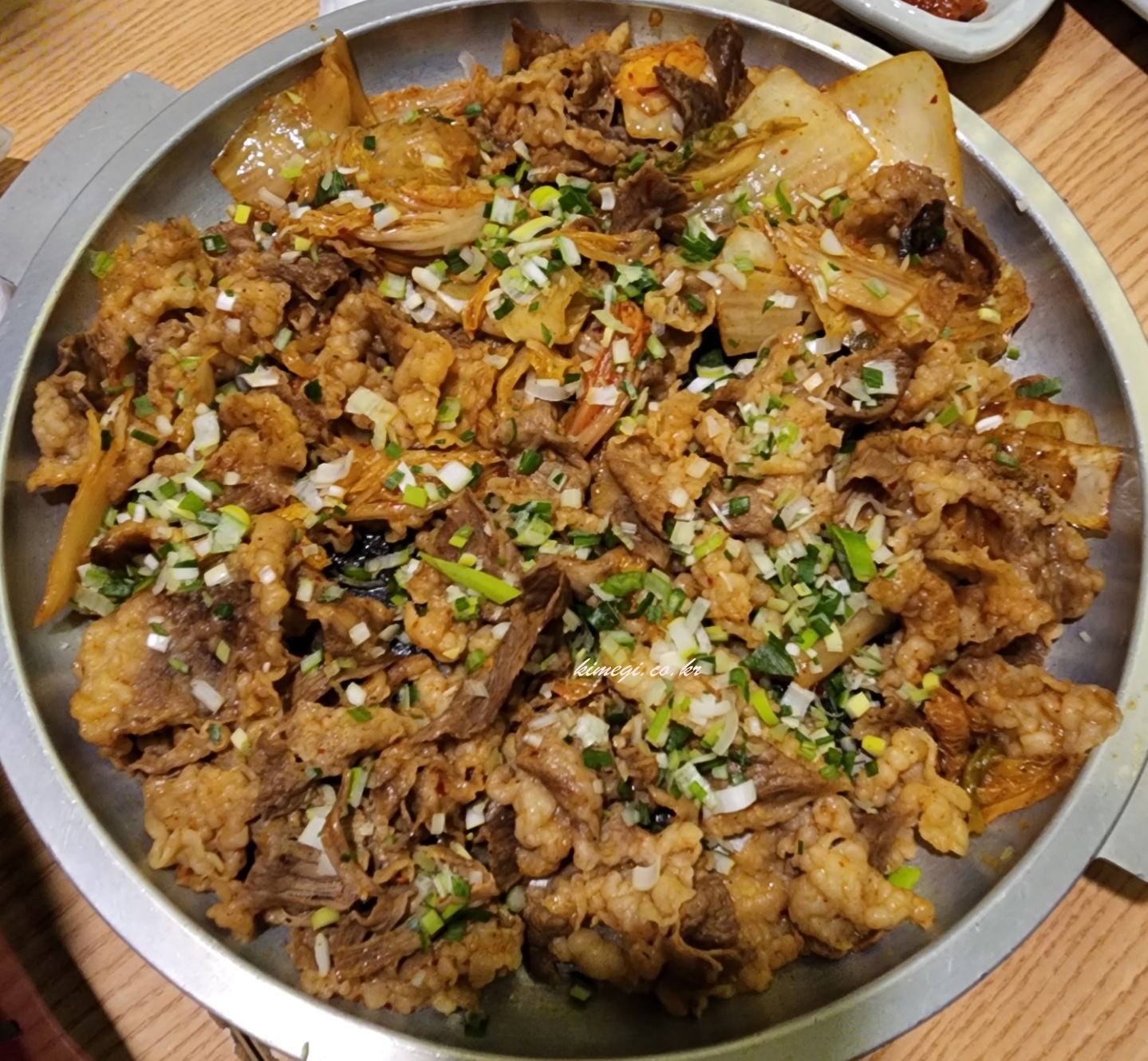 차돌 김치 구이도 2인분 나왔습니다. 차돌밖이를 김치와 구웠는데 당연히 맛있습니다. 그런데 저와 친구들은 삼겹살김치볶음이 더 맛있었어요. 김치와 소고기보다 돼지고기가 더 잘 어울리는 것 같더라고요. 그래서 나중에 친구가 늦게 왔을 때 돼지김치볶음으로 다시 주문했습니다.
