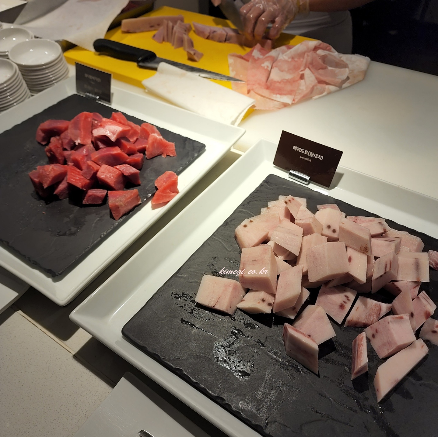 자리로 안내해준 뒤에 바로 초밥, 회 코너로 가게 되더라고요. 뷔페에서 알바도 해보았고 많이 먹어보았는데 일단 회가 얼마가 신선한지, 냉동이 아닌 생물인지 등을 보면 뷔페의 전체 퀄리티를 알 수 있겠더라고요. 결혼식 뷔폐의 회나 초밥의 횟감을 보면 사실 냉동이 많고 수입으로 밍밍한 생선을 많이 사용합니다. 그런데 63 빌딩 파빌리언은 역시 가격에 맞게 정말 싱싱하고 쫀득한 횟감을 사용하는 것 같아요. 물론 뷔페이기 때문에 횟집 정도라고 생각하면 될 것 같아요.