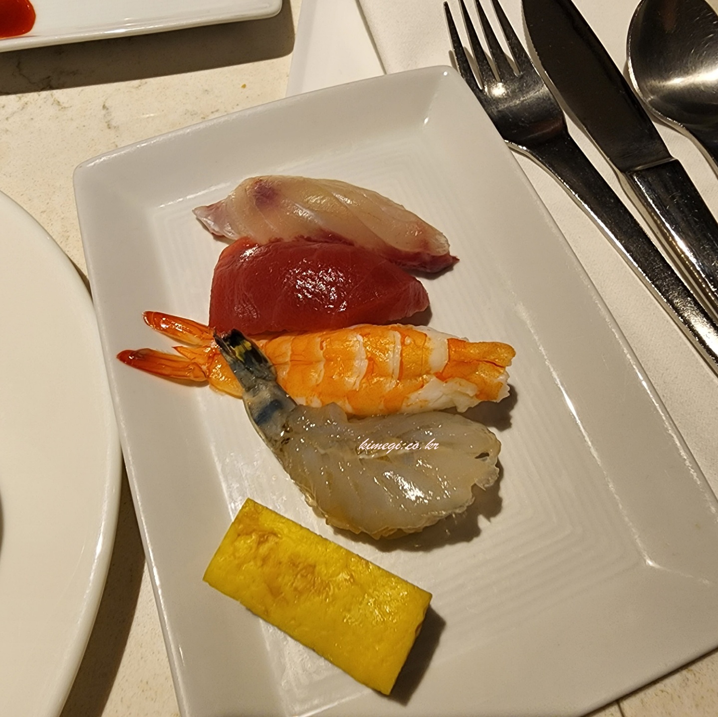 육회, 유부초밥, 연어, 김말이 등 다양한 초밥도 있었습니다. 다 너무 맛있었어요. 하나씩 먹으니까 배가 부를 정도로 종류가 많더라고요.