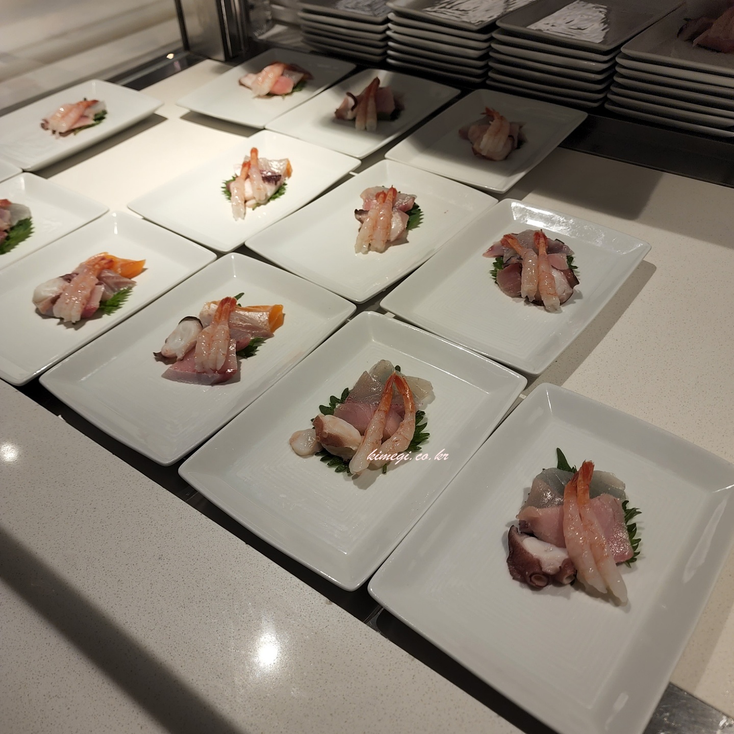 회도 연어, 새우, 문어, 등등의 회가 접시에 담겨 있었어요. 그래서 회 코너에 줄이 길게 서있지 않아서 좋았어요. 바로바로 가져가서 먹을 수 있어서 좋은 것 같아요.
