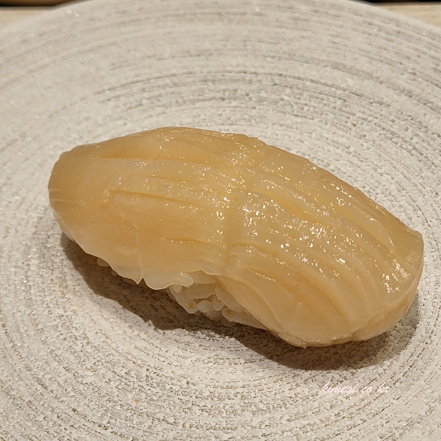 세 번째 초밥은 가리비 관자 초밥이었습니다. 칼집이 촘촘하게 나있고 숙성이 잘되어서 정말 부드러웠습니다. 진짜 이렇게 부드러운 관자는 처음 먹어보았습니다. 레몬즙과 소금을 뿌려서 새콤하고 맛있었어요. 관자 특유의 비림이 살짝 있었지만 그것이 또 좋았습니다.