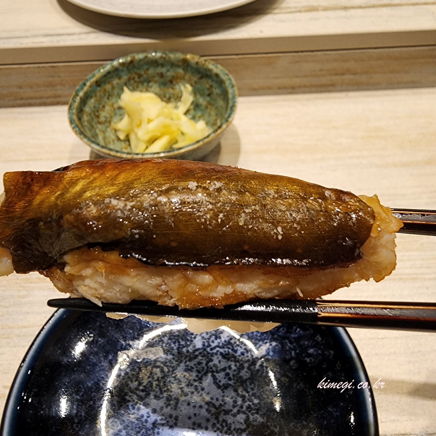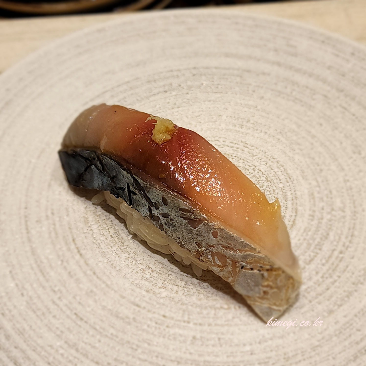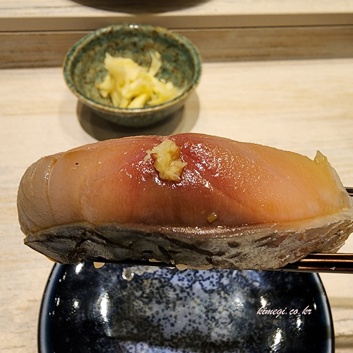 다섯 번째는 전갱이 초밥입니다. 전갱이 위에 생강이 올려져 있었는데 전갱이와 참 잘 어울렸습니다. 너무 부드러웠고 기름기도 삼치보다 적으면서 덜 비렸어요.