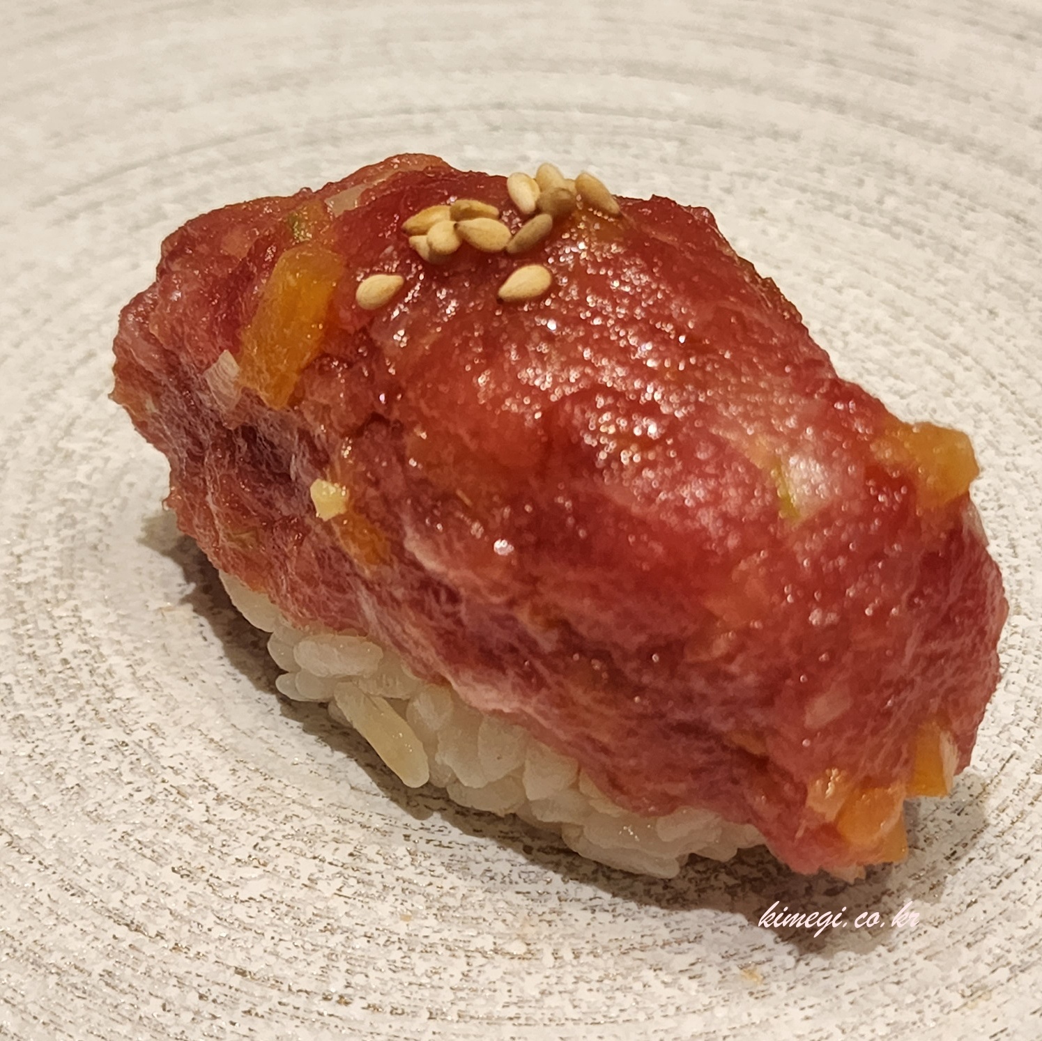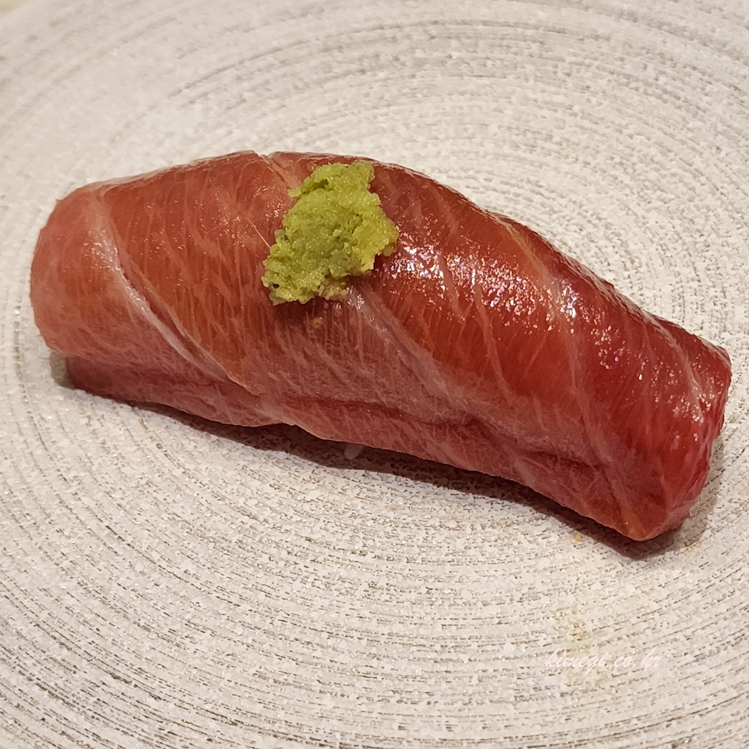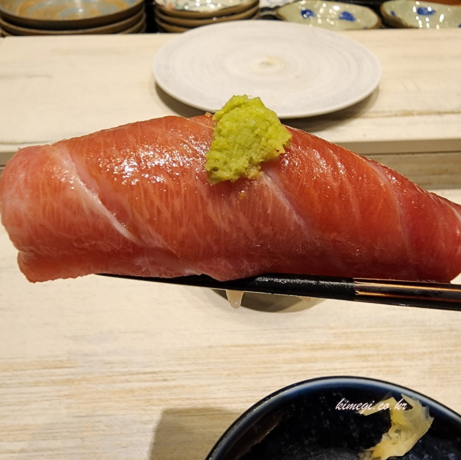 일곱 번째는 간장에 절인 참치 등살이었어요. 기름기가 적은 등살이라서 방어를 먹고 난 다음이라 조금 부족한 느낌이었어요. 저는 기름기가 많은 생선을 좋아해서 그런 것 같아요.