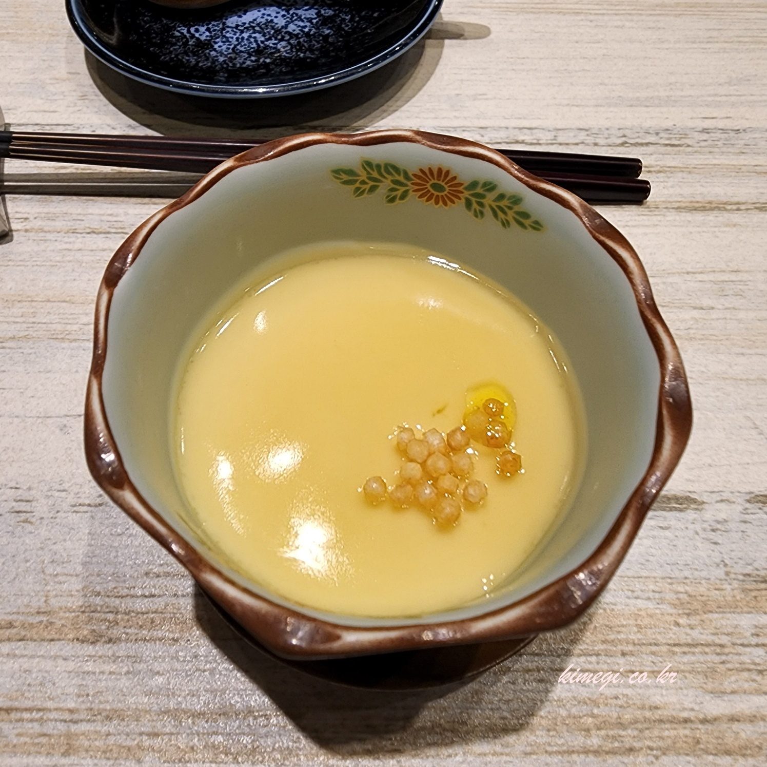 런치코스의 첫 번째 메뉴는 일본식 계란찜이였습니다. 부드러운 계란찜안에 새우가 들어있었고 트러플오일이 뿌려져 있어 향이 좋았습니다. 트러플 향을 별로 안좋아했는데 너무 잘 어울려서 좋았습니다. 새우알 튀김? 튀김이 뿌려져 있어서 식감도 좋아 아주 맛있는 전체요리였습니다.