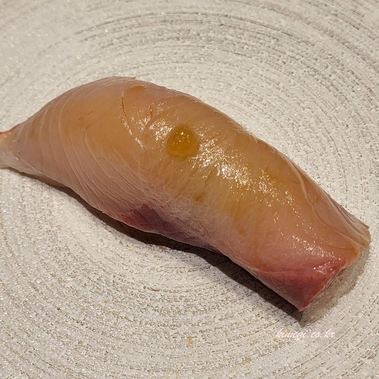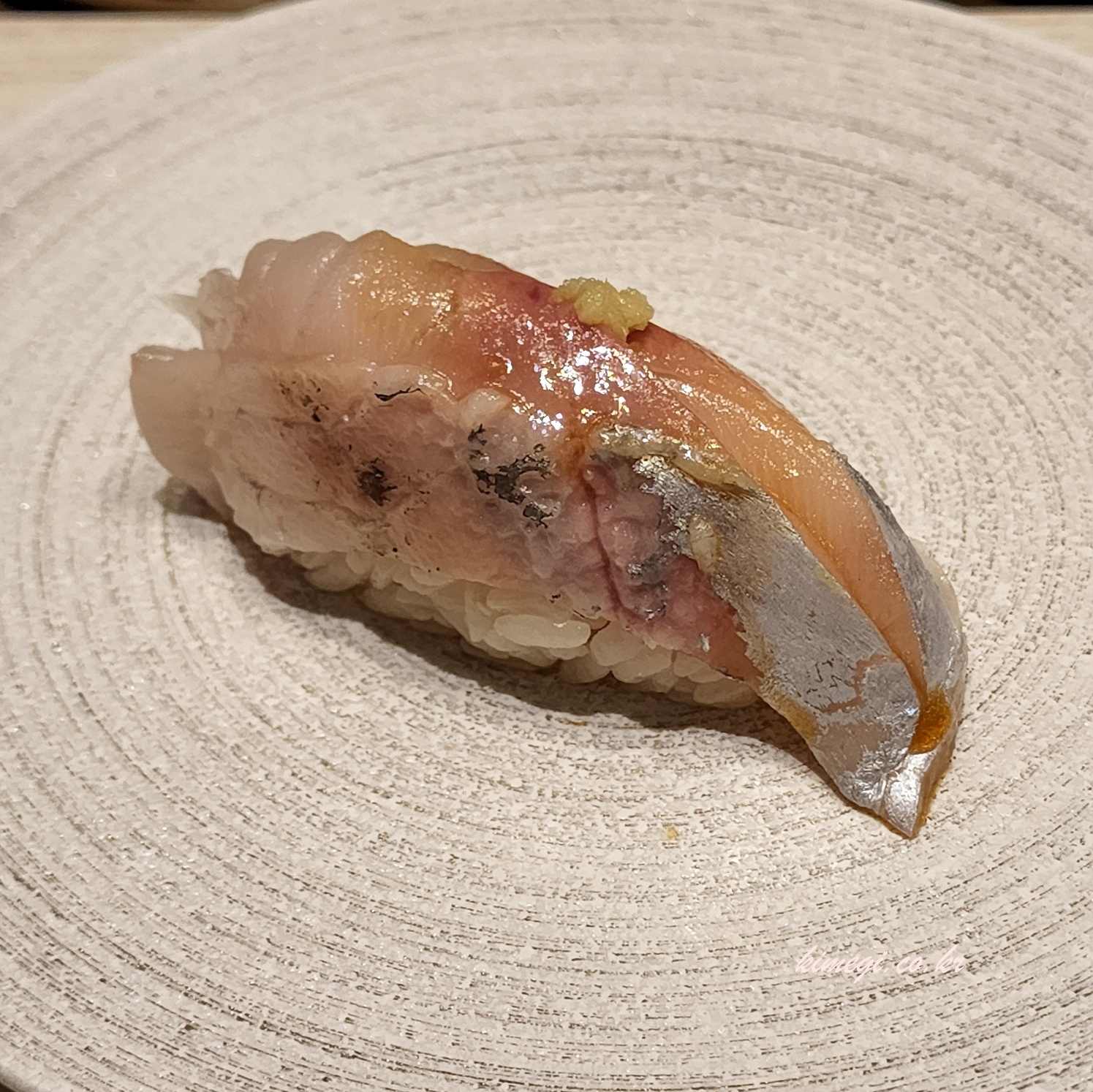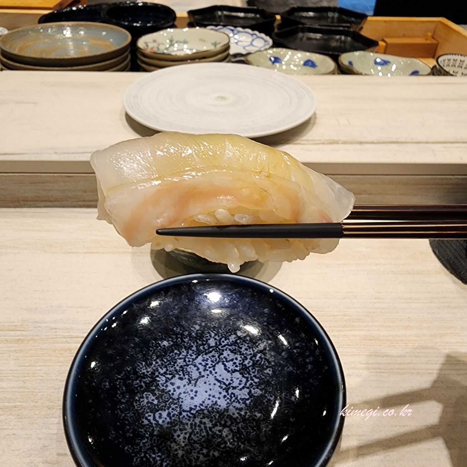 두 번째 초밥은 다시마에 맛 들인 참돔 초밥입니다. 초밥과 밥 사이에 실파가 들어있었고 광어보다 쫀득한 식감이 너무 좋았습니다. 광어와 비슷해 보이지만 훨씬 맛있었어요. 다시마의 감칠맛 때문인지 새콤한 향이 덜 나서 그런지 광어보다 맛있었습니다.
