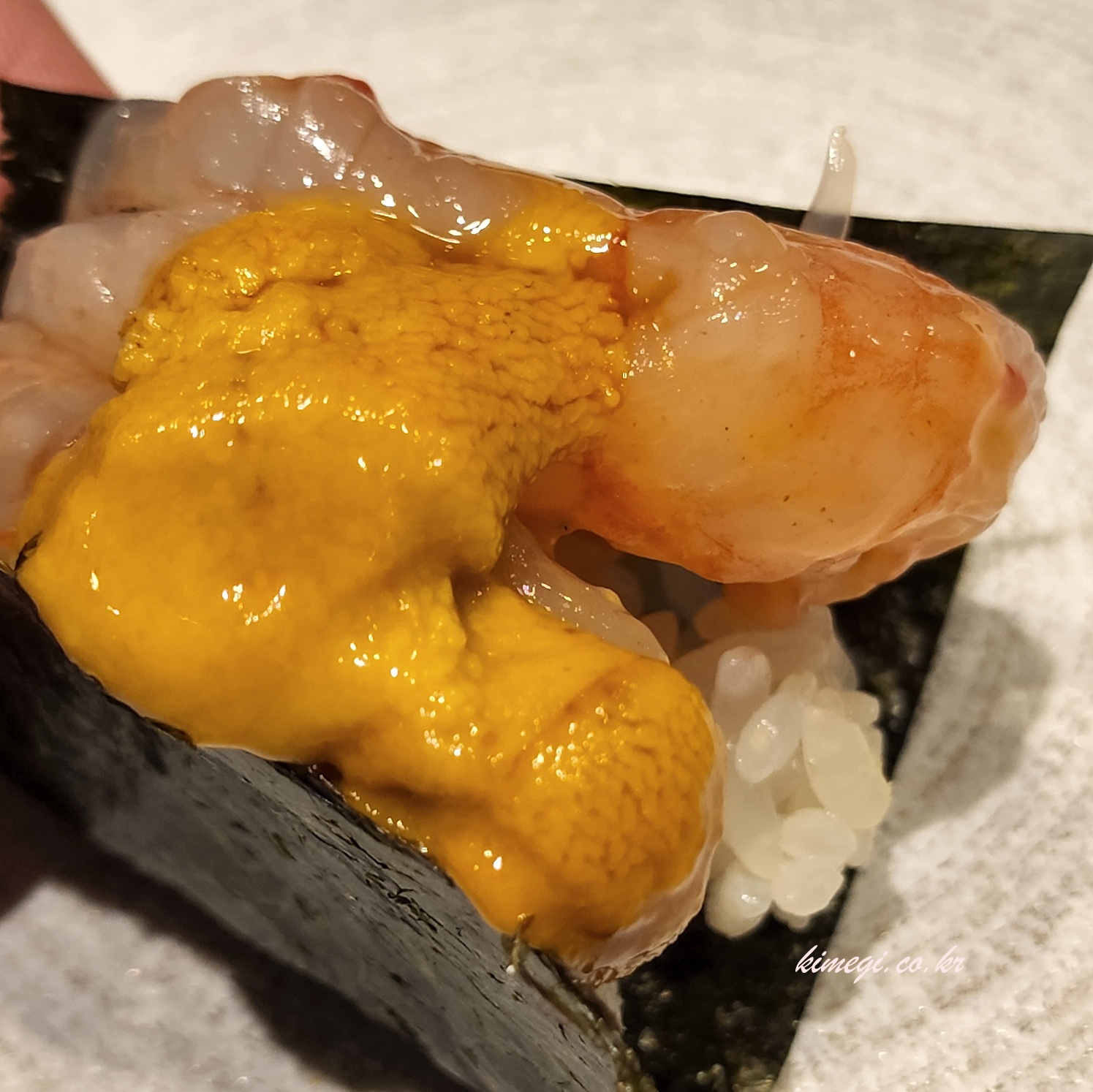 열 번째는 우니 김초밥이었습니다. 김 위에 초밥과 함께 간새우, 성개알을 올려 손으로 바로 쥐어주셨어요. 우니만 먹는 것보다 쫀득한 새우와 같이 먹으니까 정말 맛있었어요. 우니의 향이 새우의 쫀득함과 섞여서 입안 가득 우니향이 가득했어요. 향이 좋은 초밥을 뒤에 배치한 이유를 알 것 같았어요.