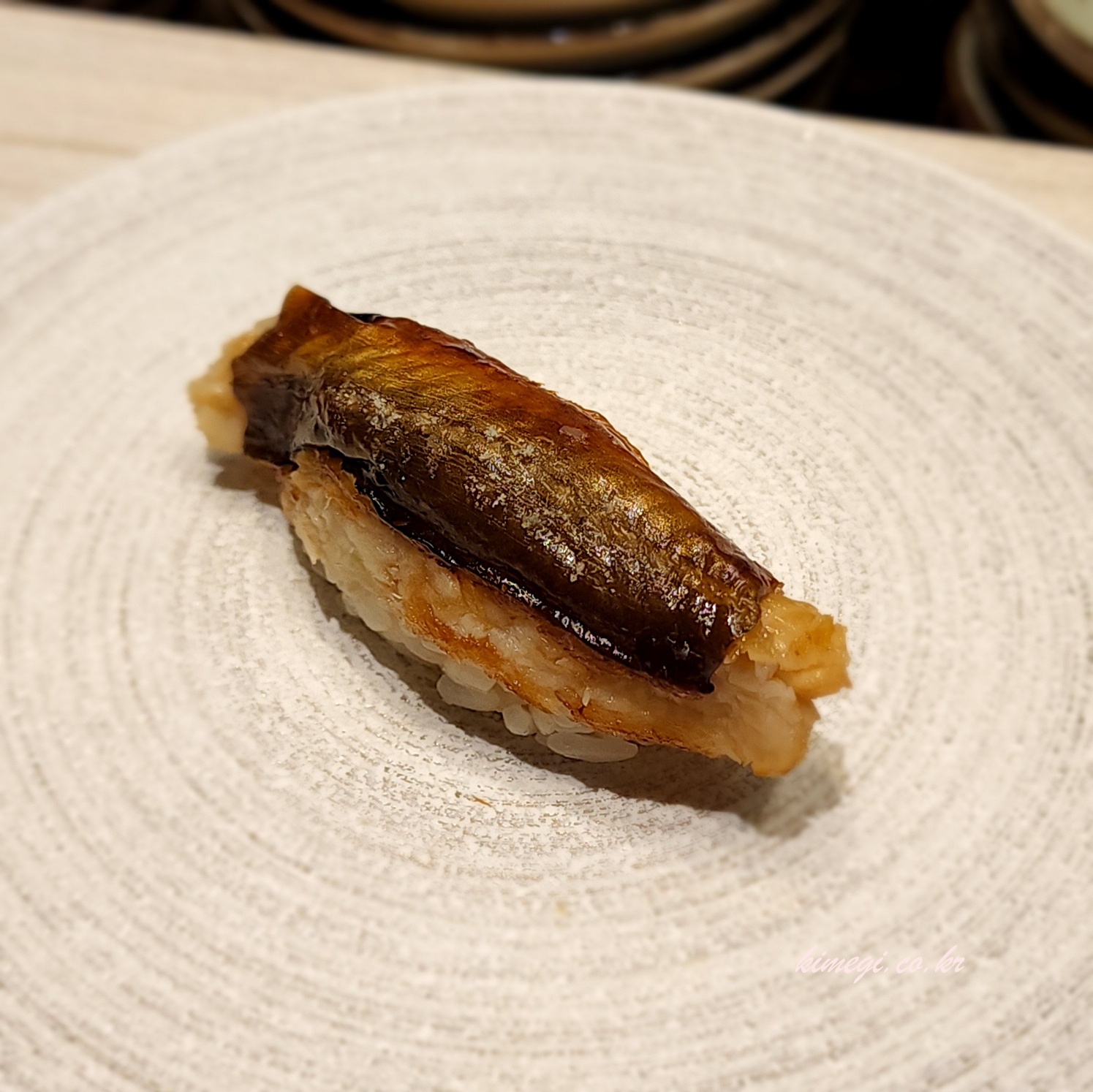 네 번째 초밥은 간장에 절인 삼치 초밥입니다. 삼치 껍질을 직화 해서 불맛을 내었고 고등어와 비슷하면서도 짭짤한 맛이 아주 맛있었습니다. 고등어 초밥을 정말 좋아하는데 삼치도 정말 맛있었어요.