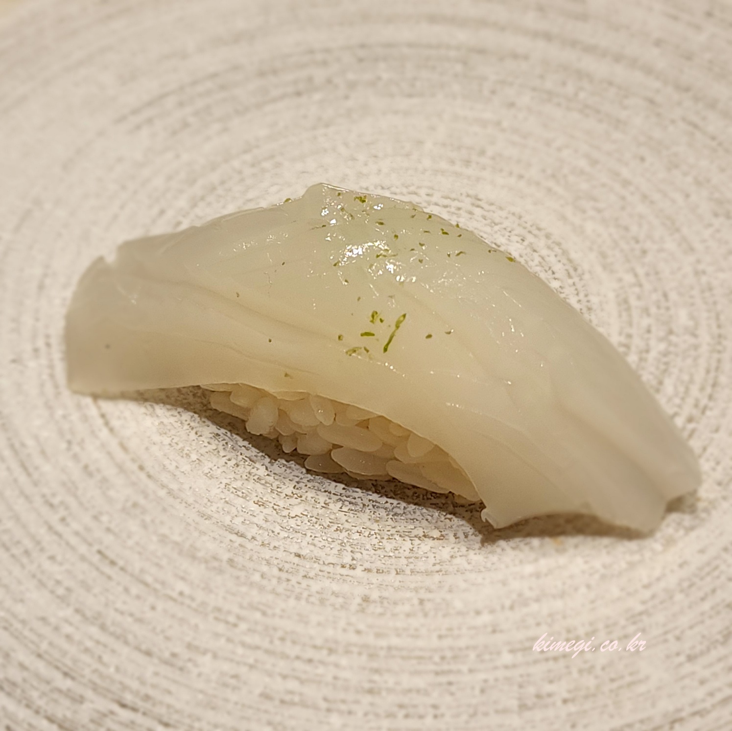 아홉 번째 초밥은 한치초밥입니다. 한치초밥 위에 라임 껍질을 뿌려서 새콤했고 부드러우면서 쫀득한 식감도 좋았어요. 한치의 향이 입안에 골고루 끈적인 한치향이 달라붙는 것 같은 느낌이었어요.
