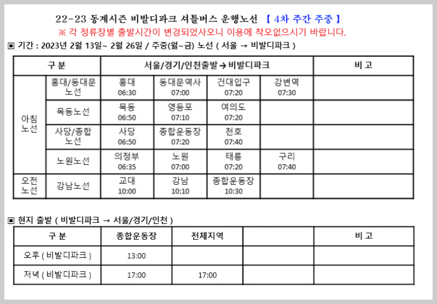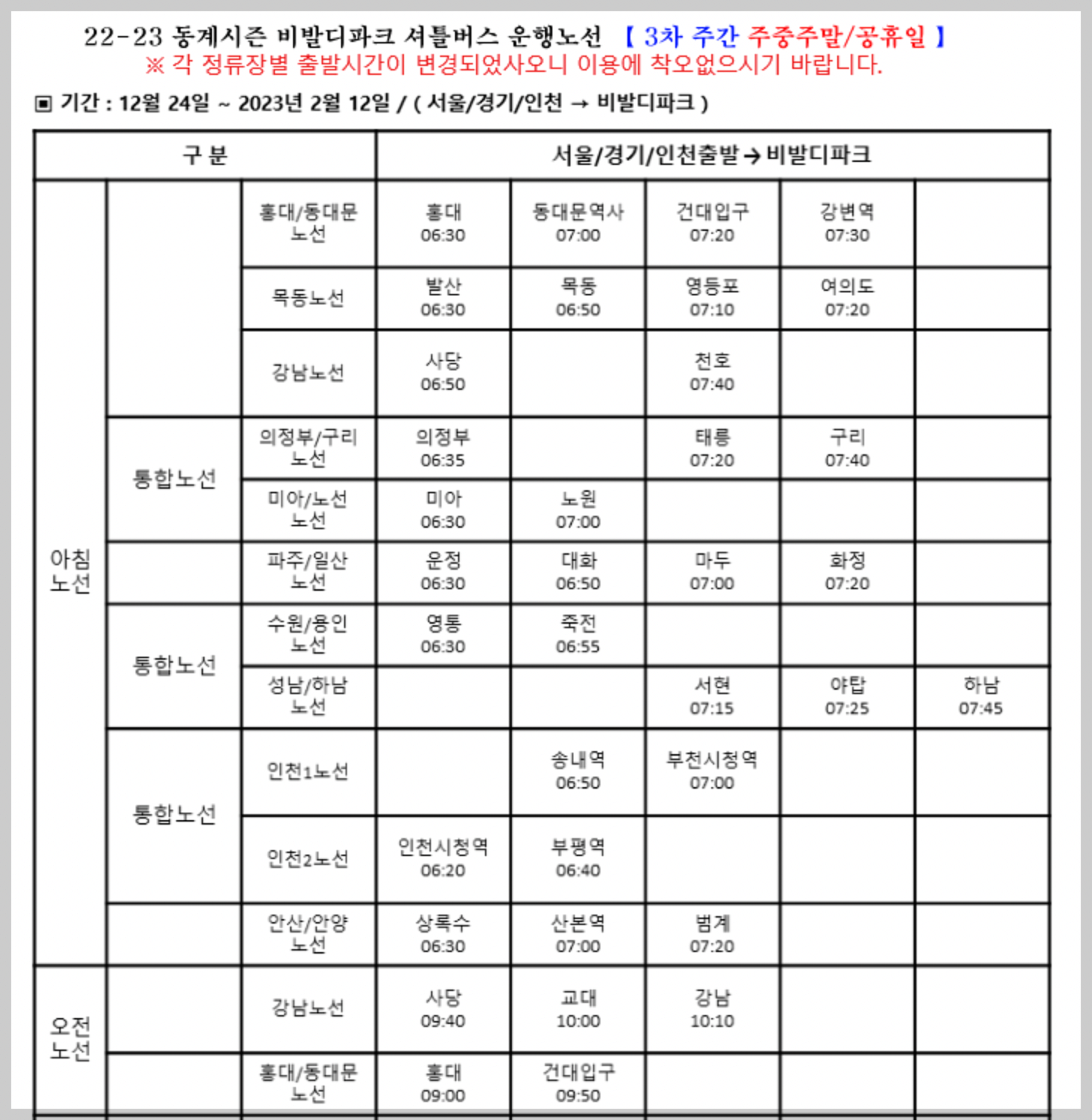 22-23 동계시즌 비발디파크 셔틀버스 운행노선 노선표입니다.