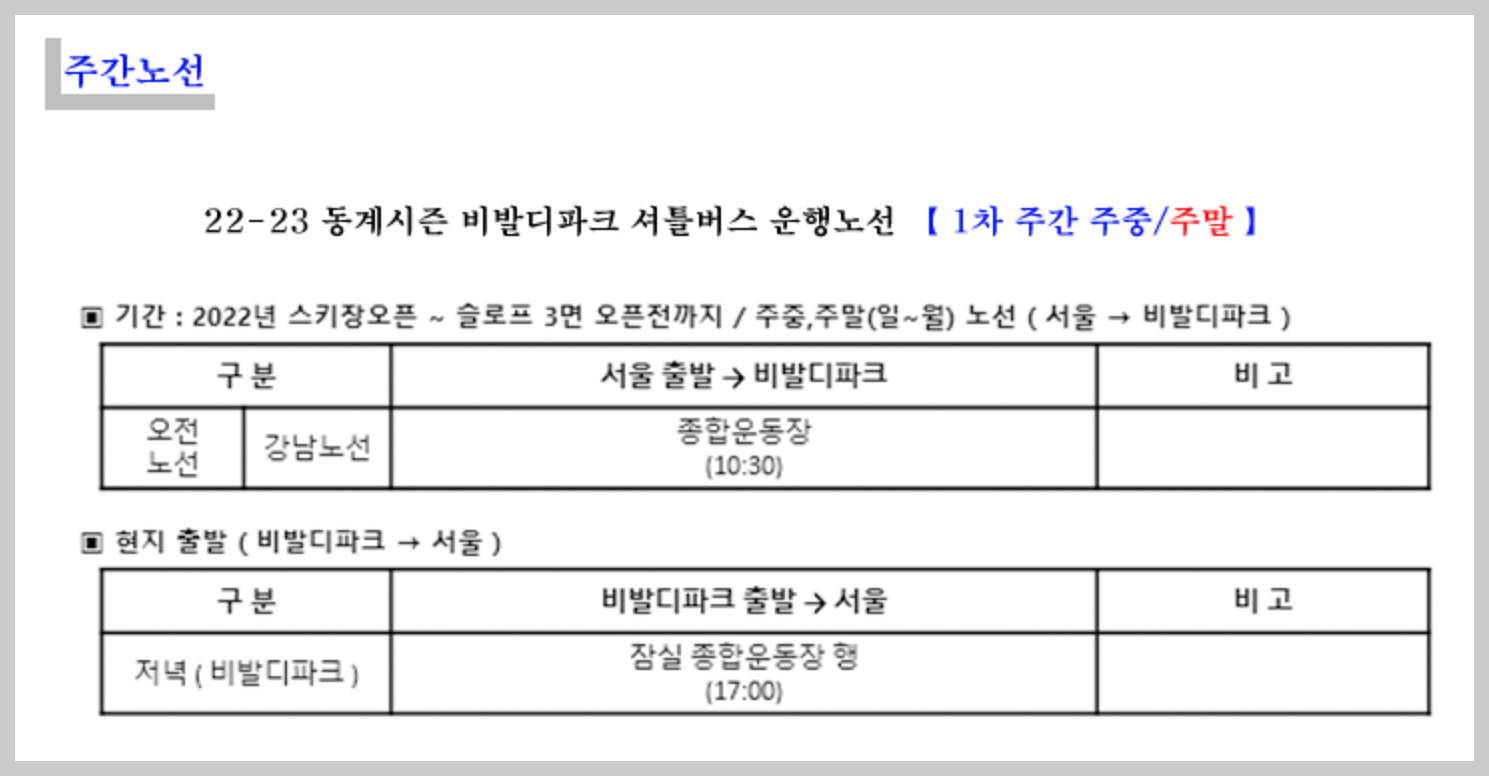 이번 겨울은 추위가 늦게 와서 스키장이 언제 개장하는지 마음 졸였던 사람들이 많더라고요. 드디어 추위가 왔고 스키장이 개장했습니다. 서울에서 스키장을 가기에는 차가 있다면 편하긴 하지만 차가 없이는 스키장을 가기가 쉽지 않습니다. 저는 그래서 셔틀버스가 있는 강원도 홍천 비발디파크를 자주 방문합니다. 비발디파크 셔틀버스는 서울의 다양한 지역에 있어서 이용하기 좋아요. 소노벨 비발디파크 셔틀버스 운행 시간, 노선표 공유합니다.