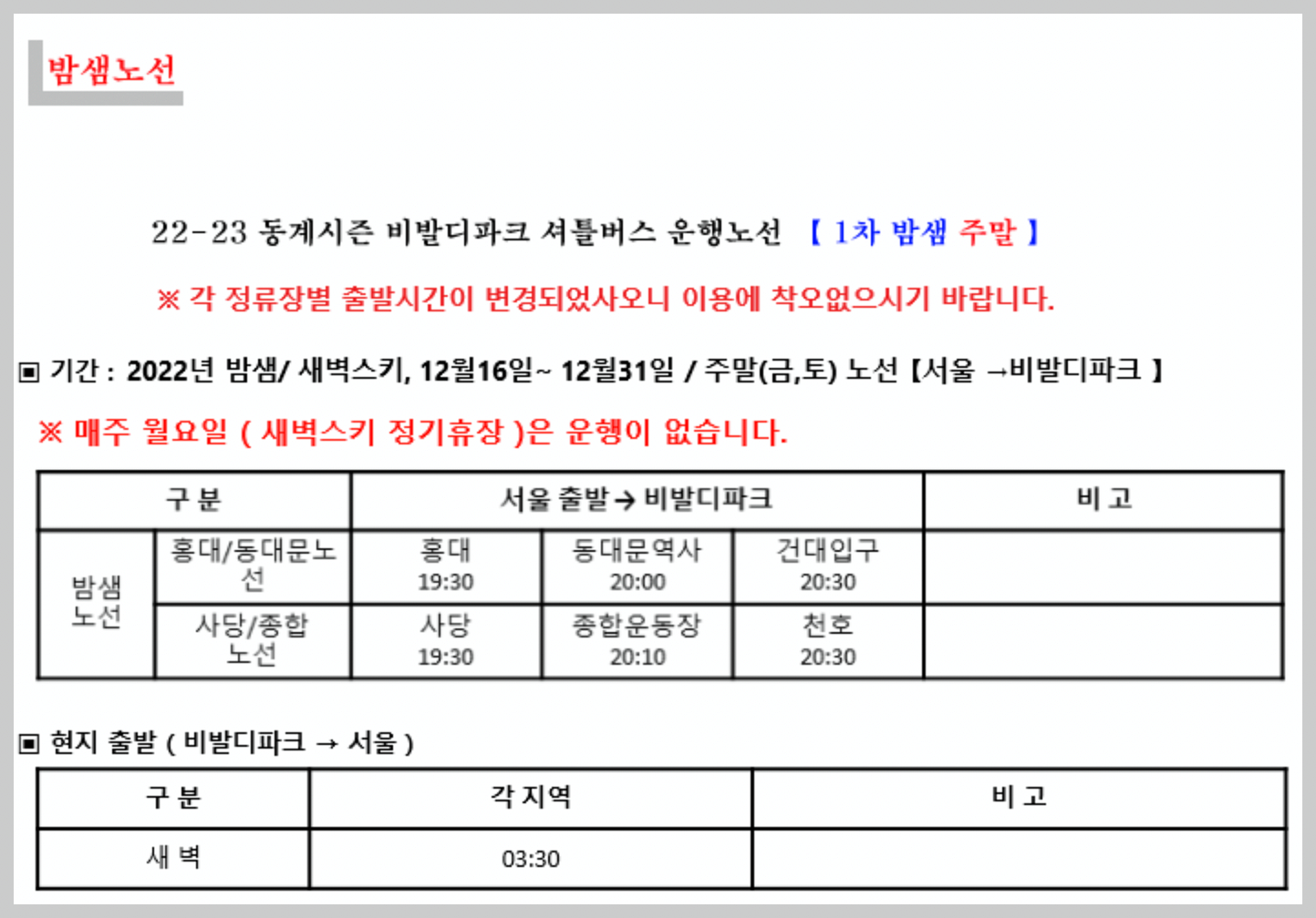 비발디파크 수도권 유료셔틀버스 운영안내