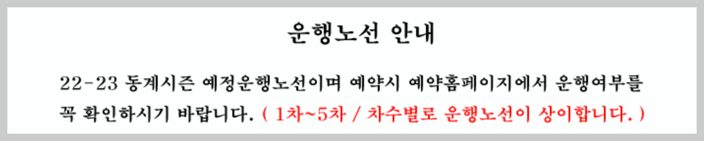 22-23 동계시즌 비발디파크 셔틀버스 운행노선입니다. 1~5차 차수별로 운행노선이 상이하고 예정 운행노선을 확인하시어 예약하시고 이용하시면 됩니다.