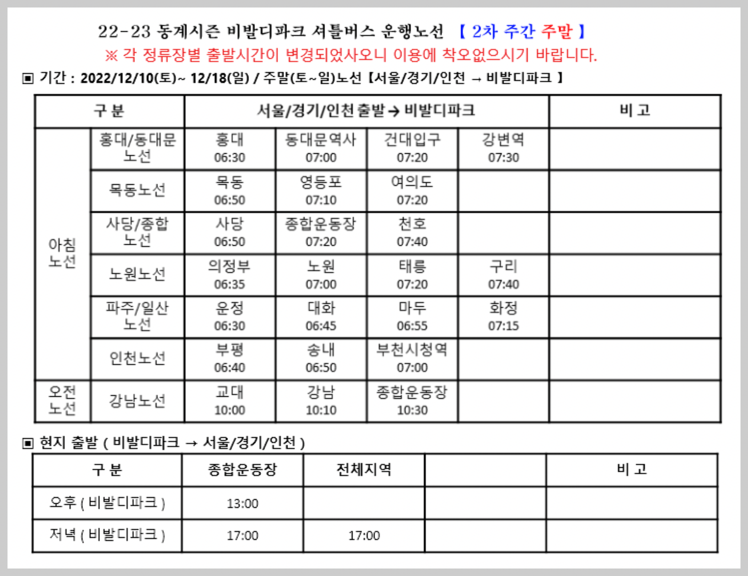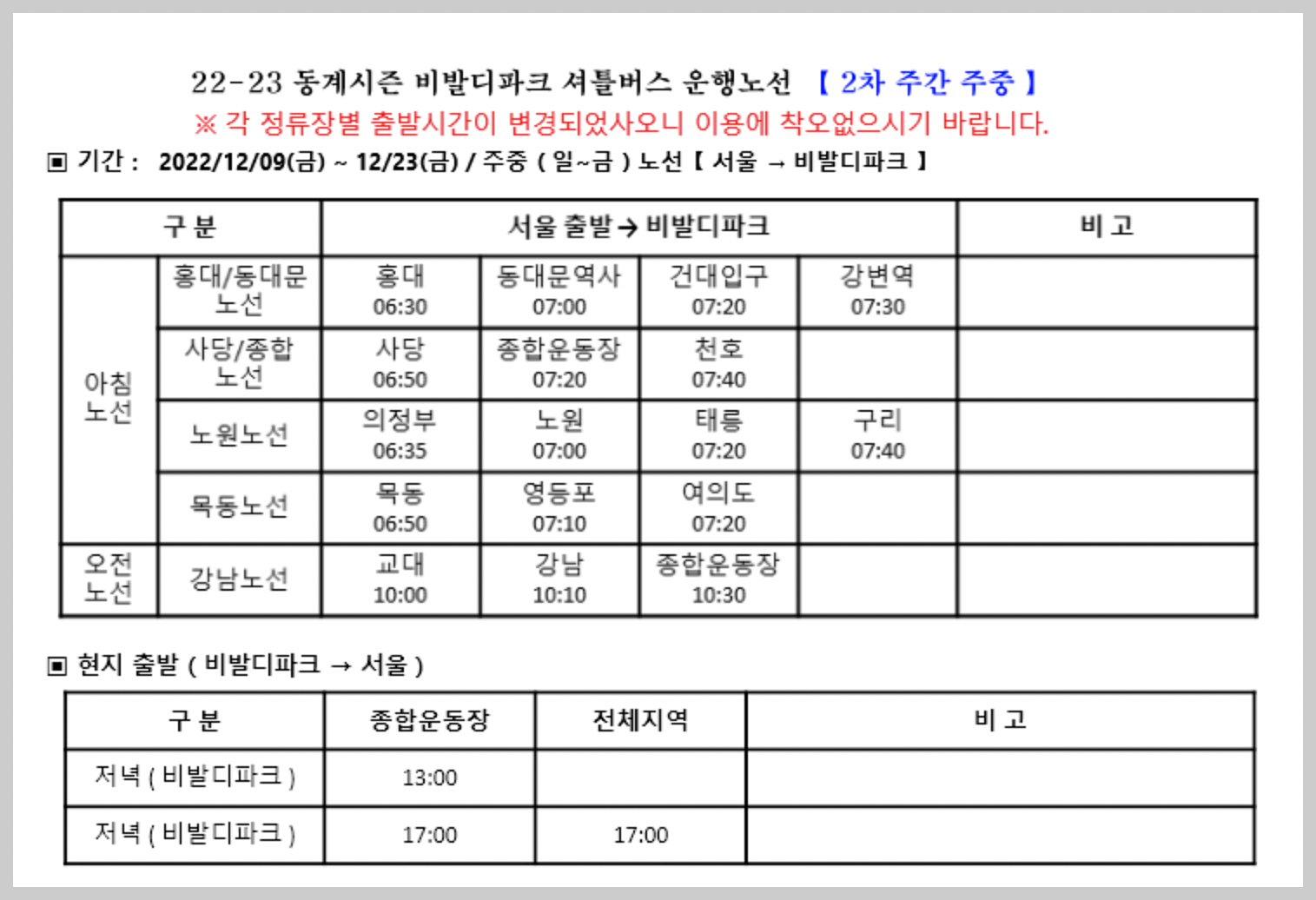 22-23 동계시즌 비발디파크 셔틀버스 운행노선 노선표입니다.