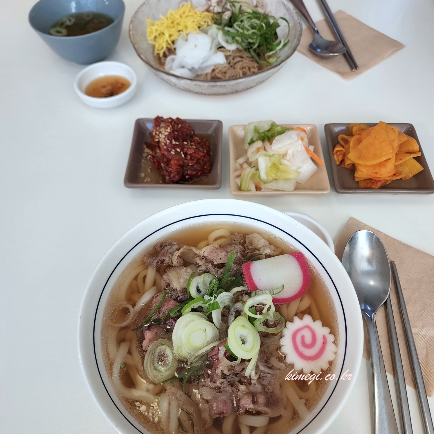 저는 따끈한 소고기우동을 주문했고 여자친구는 낙지젓 들기름 찰보리면을 주문했습니다. 음식이 아주 깔끔하게 나와서 사진 찍기에도 좋고 맛있어 보였어요.