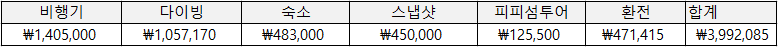 태국 여행 경비 내역입니다. 2인이 다녀왔고 400만원 정도 사용했어요. 비행기와 스쿠버다이빙, 스냅사진 비용을 빼면 100만원 정도 밖에 사용하지 않았어요. 진짜 저렴하게 다녀온 것 같아요. 환전은 백만원을 해갔는데 다이빙을 현지돈으로 절반 지불했습니다.
