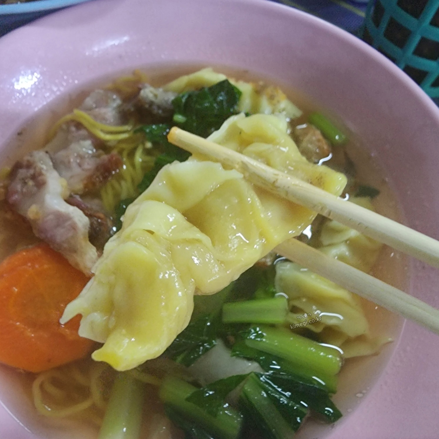 닭고기 육수인 국수는 아주 깔끔했어요. 안에 닭고기와 얇은 만두가 들어가 있었고 야채는 시금치 같으면서도 아욱 같은 채소가 들어있었어요. 검색하지 않고 왔는데 정말 맛집을 찾았어요. 국물이 진짜 시원하고 깔끔했어요. 일본에서 먹은 라멘보다 훨씬 맛있는 것 같아요.