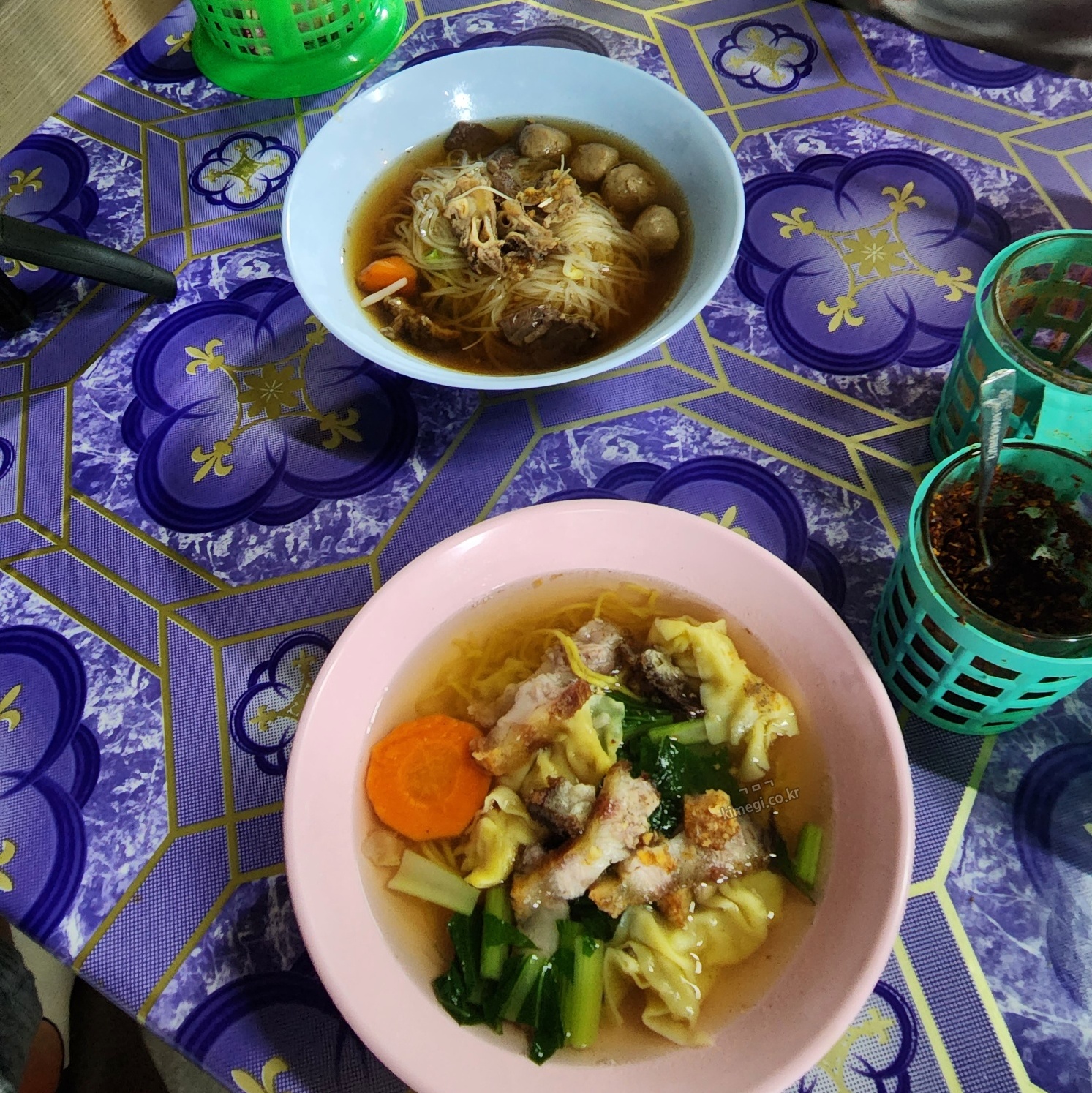 국수가 2그릇 나왔습니다. 하나는 소고기 육수인 국수이고 하나는 닭고기 육수인 국수인 것 같아요. 그런데 솔직히 제가 먹은 메뉴의 이름을 모르겠어요. 면도 다르고 들어 있는 내용물도 달랐어요.