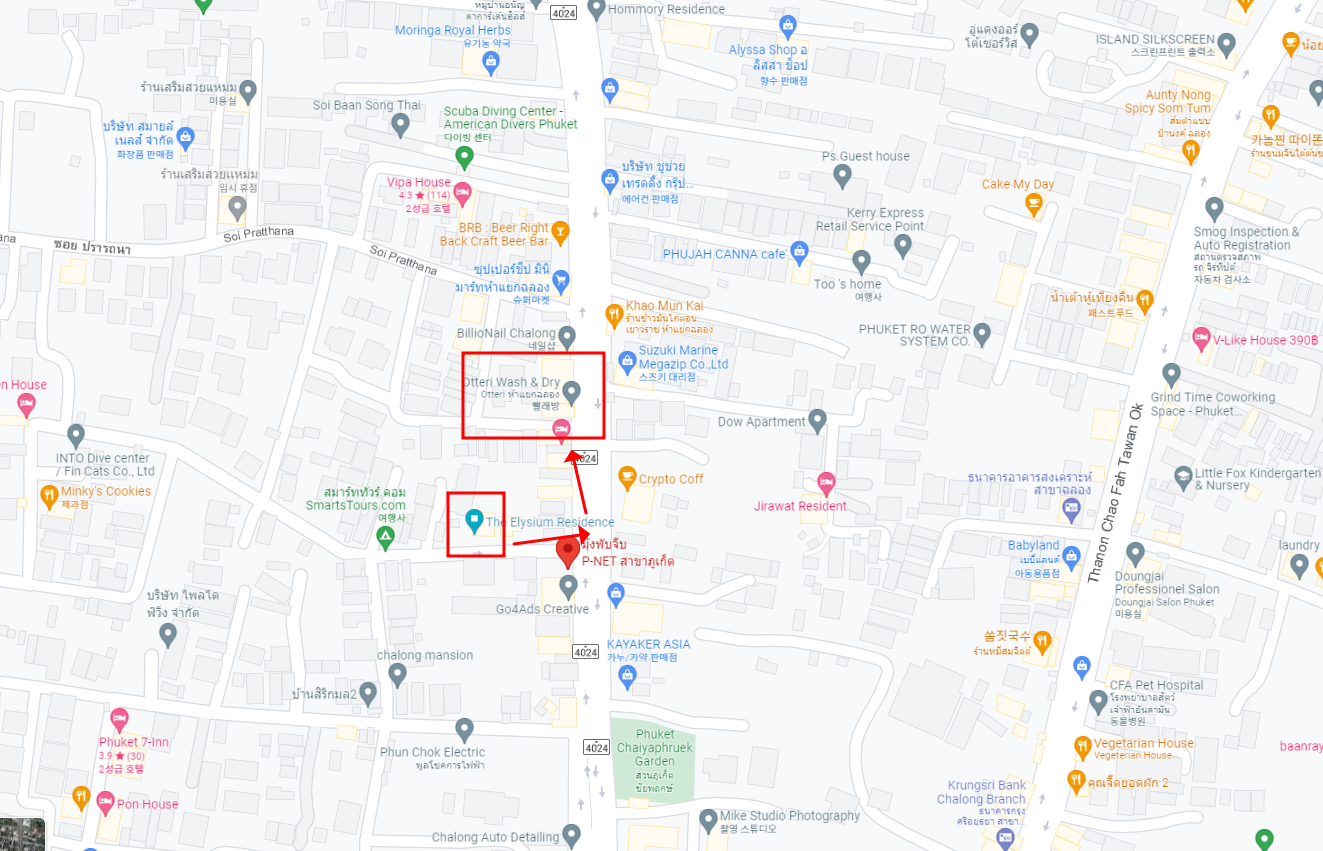 혹시나 찾고 싶으신 분들을 위해 지도로 대략 위치는 남겨 놓을게요. 제가 묶었던 엘리시움 레지던스에서 큰길로 나와 빨래방 쪽으로 걸어가면 나와요. 푸껫 찰롱에서 다이빙을 하려는 분들은 방문할 수 있을 것 같아요.