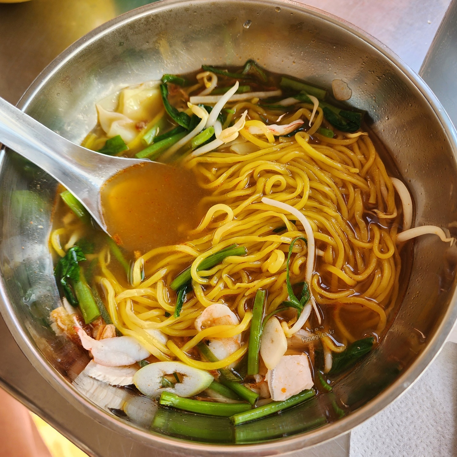 물국수는 미디움으로 주문했어요. 새우살과 미나리?와 비슷한 야채가 들어있는데 완전 새우탕면 맛입니다. 새우의 향이 진하게 나면서 맑은 미소 된장국 같아 정말 맛있었어요. 어젯밤에 술을 안 마신 것이 아쉬울 정도로 해장에 좋은 국물이었어요.