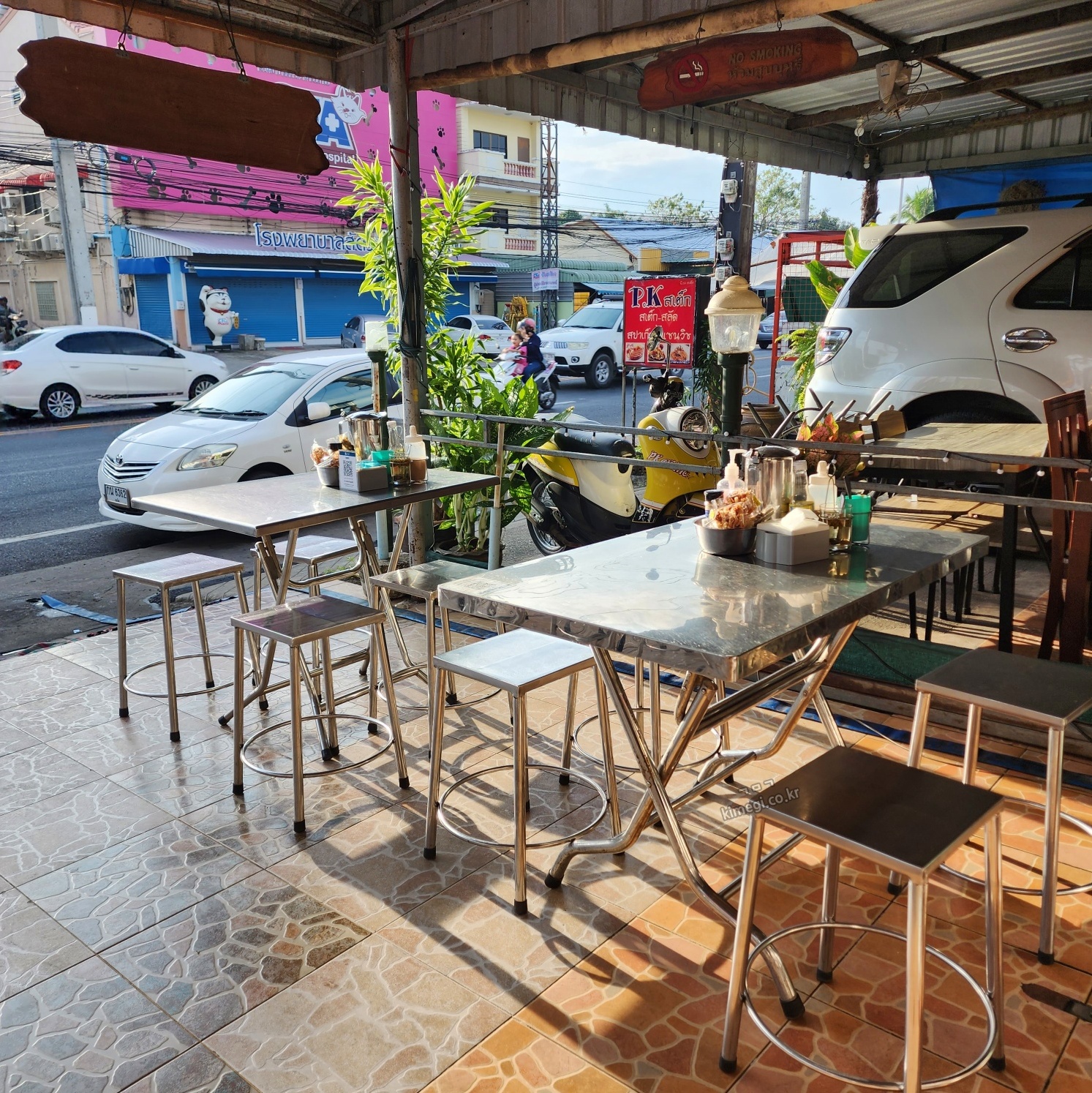 야외와 실내에 테이블이 꽤 많았습니다. 방문 시간은 오전 8시 정도였는데 가게 문이 열려 있었어요. 메뉴는 국수로 태국에서는 국수요리가 참 많은 것 같아요. 어제 저녁에도 야식으로 국수요리를 먹었는데 아침도 국수입니다.