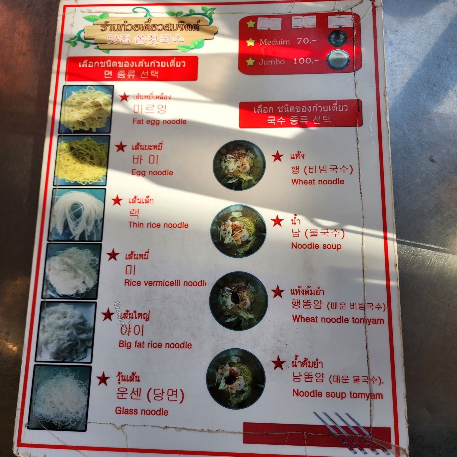 한국어 메뉴판이라 좋긴 했는데 사실 메뉴는 간단했어요. 쏨짓 메뉴 주문 방법은 일단 면을 고른 뒤 국수종류를 선택하고 미디움 또는 점보를 먹을지 선택하면 됩니다. 강사님이 면은 바미가 가장 맛있다고 추천해 주어서 바미 면을 고른 뒤 비빔국수와 물국수를 하나씩 주문했어요. 국수 가격은 미디엄이 70밧, 점보가 100밧인데 점보 기준 3,800원 정도라 정말 저렴합니다.