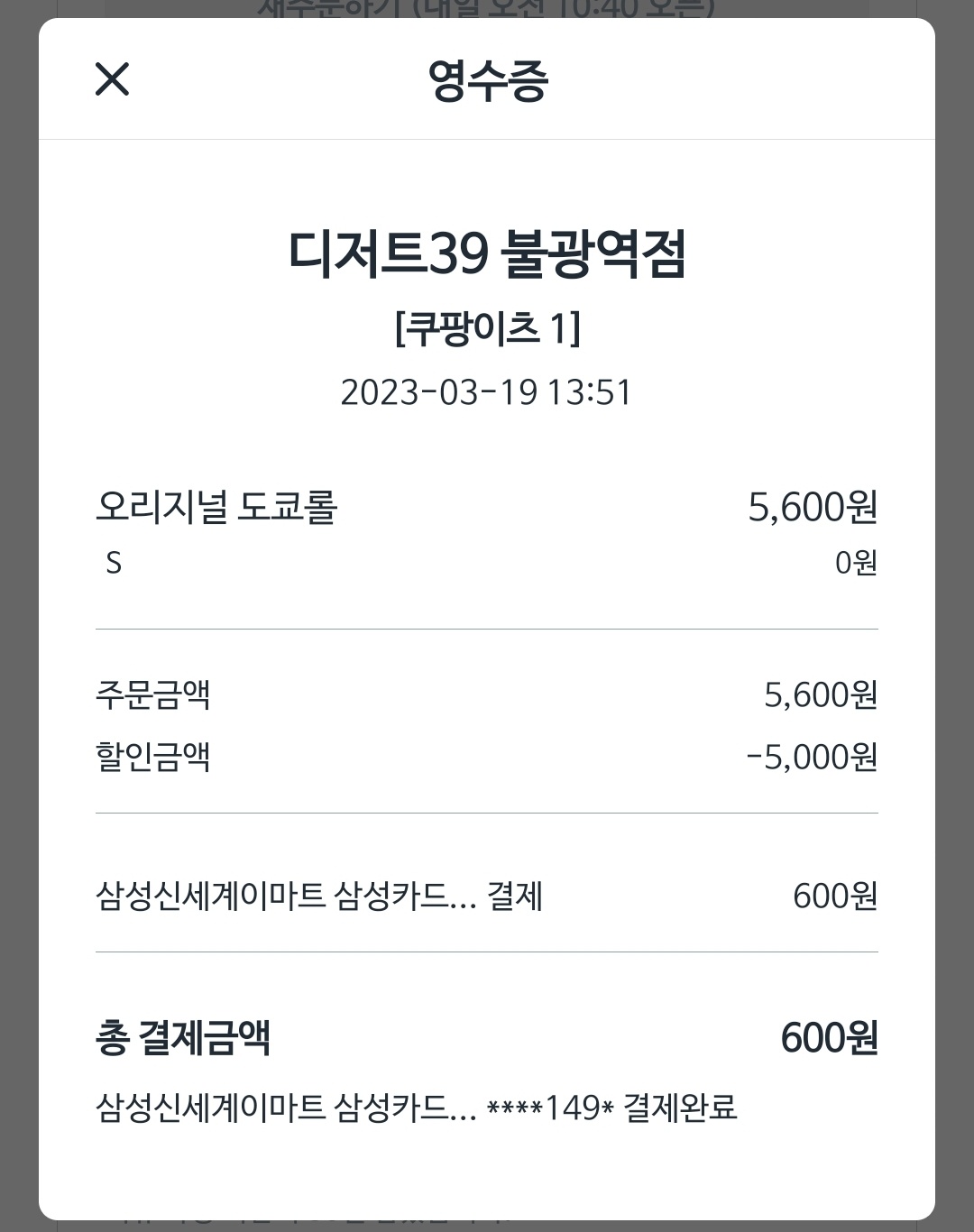 오늘 와이프와 시장을 갔다가 디저트가 먹고 싶어서 디저트39에서 도지마롤 2개를 사 왔습니다. 도지마롤 2개를 사는데 지불한 비용은 단돈 1,200원입니다. 이렇게 저렴하게 디저트 도지마롤을 먹을 수 있던 이유는 바로 쿠팡이츠 5,000원 할인 쿠폰 때문입니다.