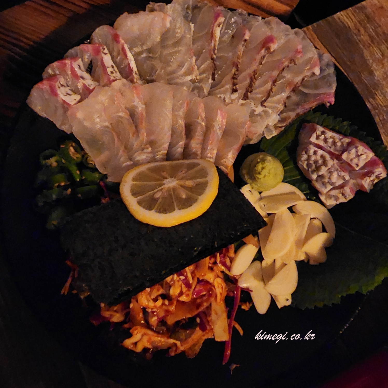 사진은 못찍었지만 활어가 있는 수족관도 있었어요. 신선한 회를 바로 떠서 먹을 수 있는 횟집이에요. 실내가 엄청 크진 않았지만 구석구석 자리가 잘 만들어져 있어서 10 테이블은 되는 것 같았어요.