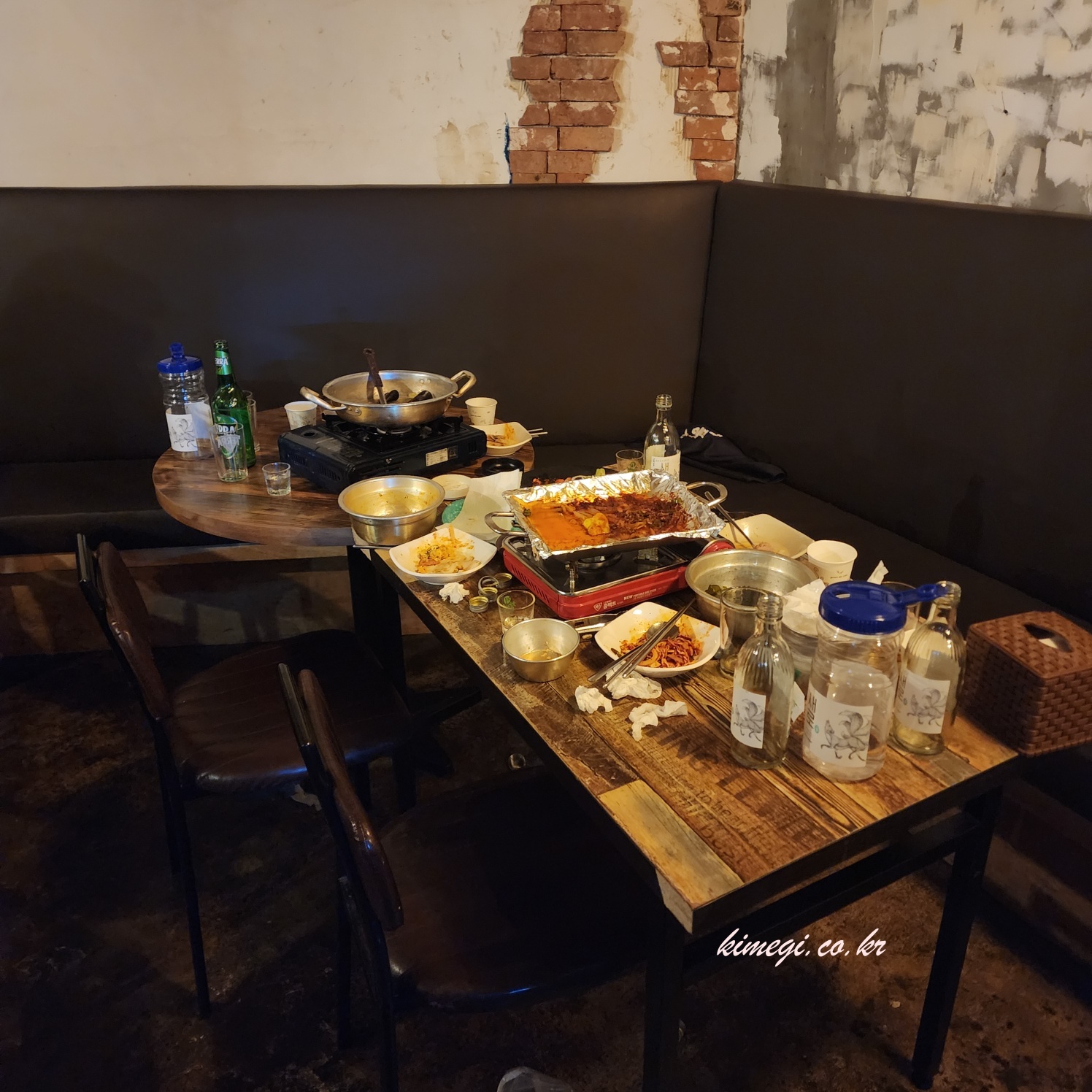 안쪽에 이렇게 테이블을 붙여서 앉았는데 넓어서 편하고 좋았어요. 술병은 안보이지만 1차에서 엄청 마셨어요. 2차 3차까지 갔는데 집에 어떻게 갔는지 모르겠네요. 왕십리 진짜 요즘 핫한 곳인 것 같아요. 역시 핫플레이스는 돌고 도는 것 같아요. 왕십리 메종드 혁이네 정말 추천합니다. 분위기 좋고 안주도 저렴하고 맛있는 곳이에요.