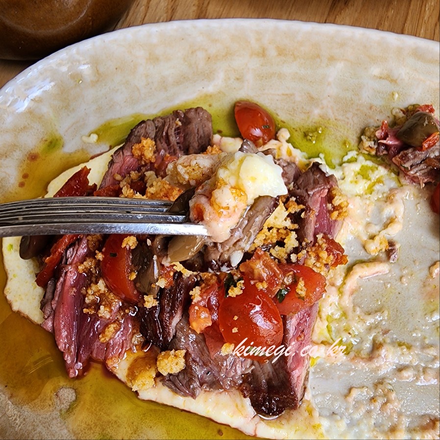 소고기 샐러드 같은 느낌으로 상큼하면서 짭짤하면서 고소한 올리브오일이 진짜 맛있었어요. 특이하게 절여진 올리브도 처음먹어보는 맛이었는데 고기와 정말 잘 어울렸어요. 고기를 결 반대로 잘게 잘라서 올리브와 샐러드를 얹어서 먹으니 진짜 맛있더라고요.