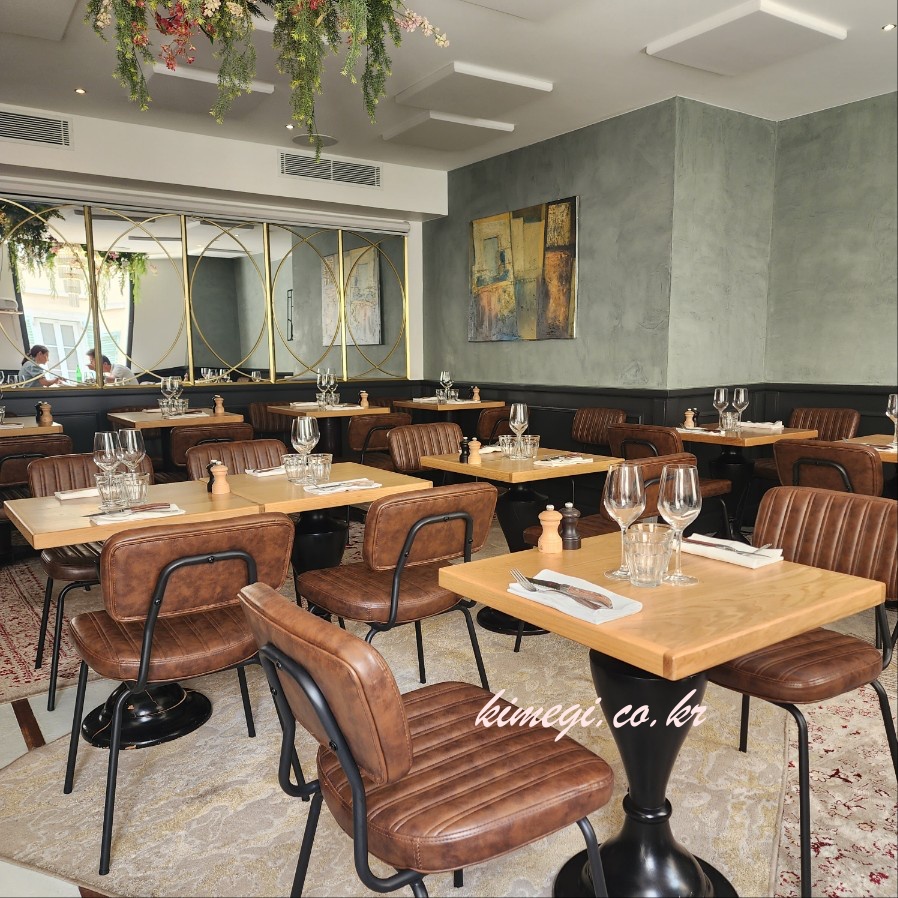 일단 숙소에 도착해서 짐을 풀고 씻고 식당으로 갔습니다. 프랑스는 거의 대부분의 식당이 12시 쯤부터 오픈을 하더라고요. 예약을 못해서 오픈 시간에 맞춰 갔는데 자리가 여유가 있어서 바로 들어갈 수 있었어요. 현지 니스 사람들은 대부분 테라스에 앉지만 저희는 시원한 실내로 들어갔어요.