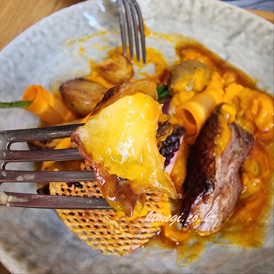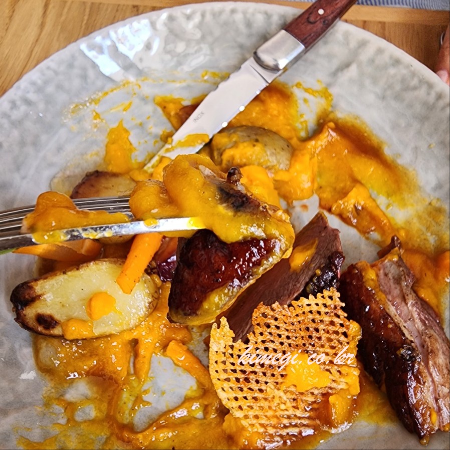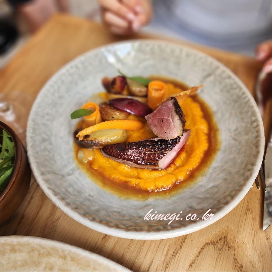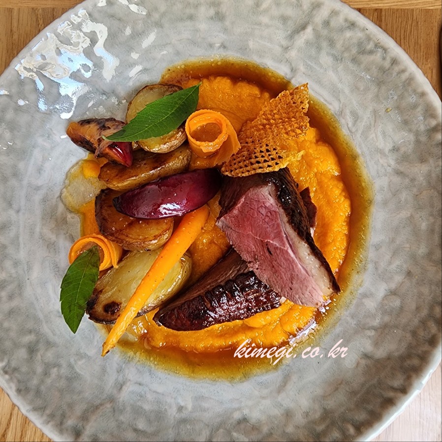 오리 가슴살에 자두와 당근으로 만든 퓨레와 감자, 당근, 자두가 들어가 있었어요. 자두로 만든 요리가 정말 특이했어요. 정말 색다른 맛이었는데 입맛에 맞지는 않았어요. 그냥 색다른 식감과 풍미를 느낄 수 있었어요.