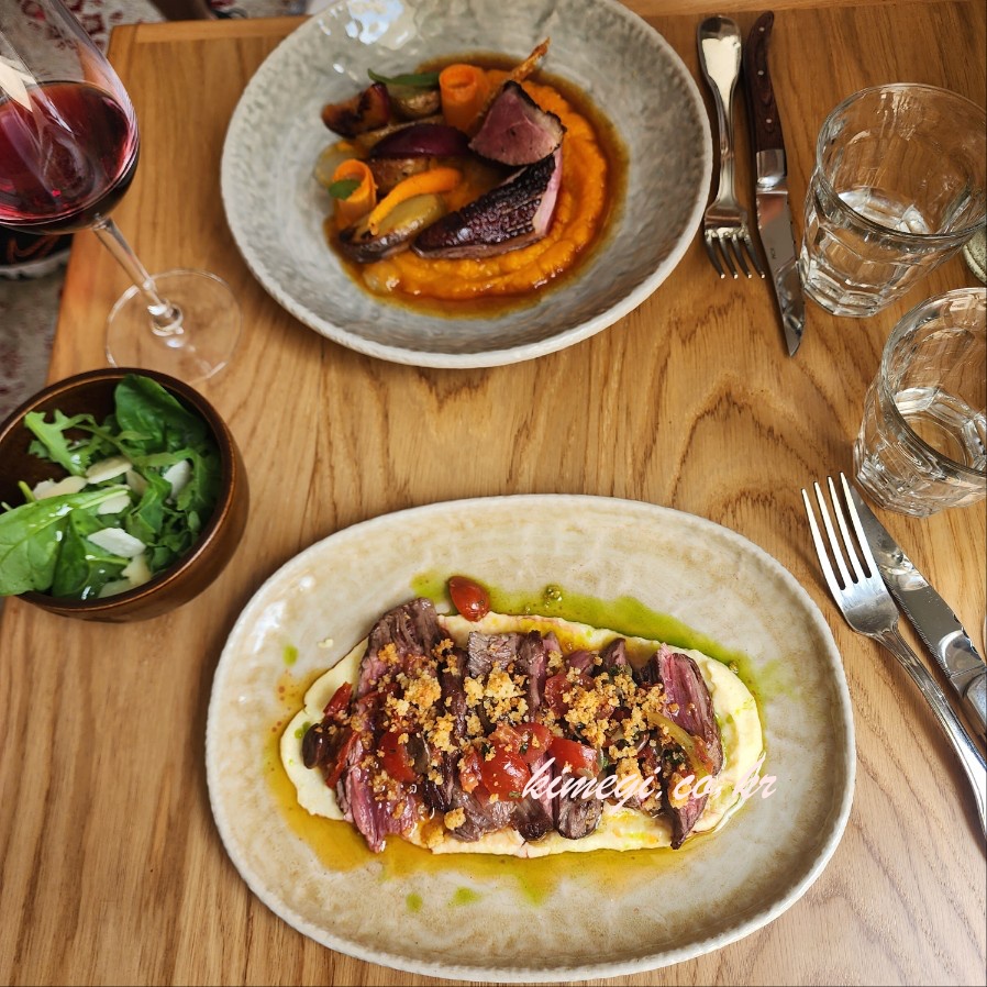 디저트를 다 먹으니 메인이 나왔습니다. 오늘의 메인은 소고기 요리이고 추가로 오리고기 요리를 주문했어요.