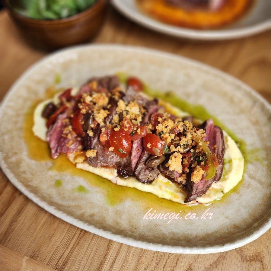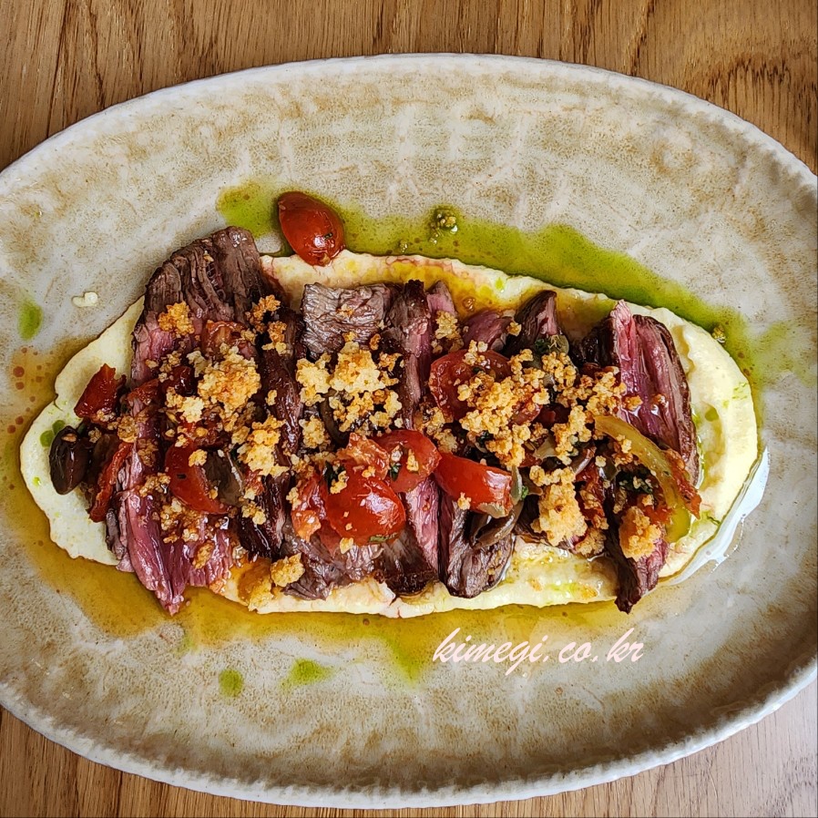 소고기 샐러드 같은 느낌으로 상큼하면서 짭짤하면서 고소한 올리브오일이 진짜 맛있었어요. 특이하게 절여진 올리브도 처음먹어보는 맛이었는데 고기와 정말 잘 어울렸어요. 고기를 결 반대로 잘게 잘라서 올리브와 샐러드를 얹어서 먹으니 진짜 맛있더라고요.