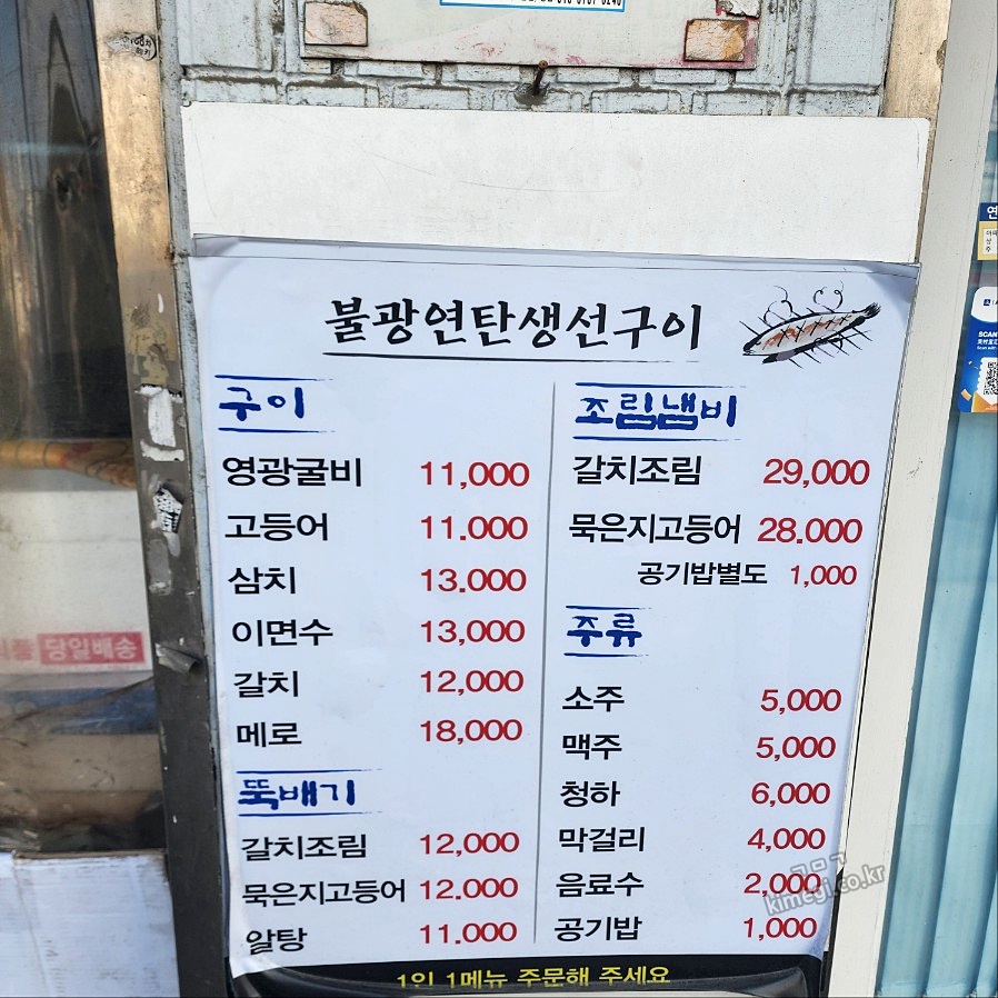 불광 연탄 생선구이 메뉴판