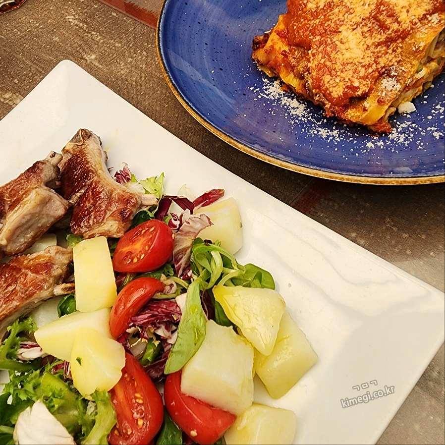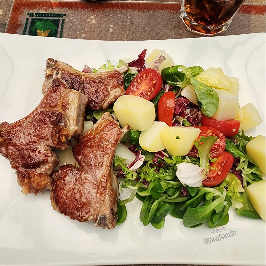 이탈리안식 양고기가 어떨까 정말 궁금했는데 고기 굽는 건 어느 나라나 비슷한 것 같네요. 양고기가 진짜 잘 구워져서 나왔어요. 올리브오일과 함께 샐러드와 감자를 같이 먹으니까 너무 맛있더라고요. 짭짤한 소금이 올리브오일에 녹아서 고기에 찍어먹으면 너무 맛있습니다.