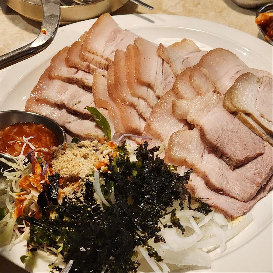 수육은 제주도식 돔배고기처럼 얇게 썰어진 수육입니다. 부드럽고 아주 맛있었어요. 쌈싸먹는 수육이 아닌 뭔가 시골에서먹을 수 있는, 새우젓만 살짝 올려서 먹으면 정말 맛있는 그런 수육입니다.