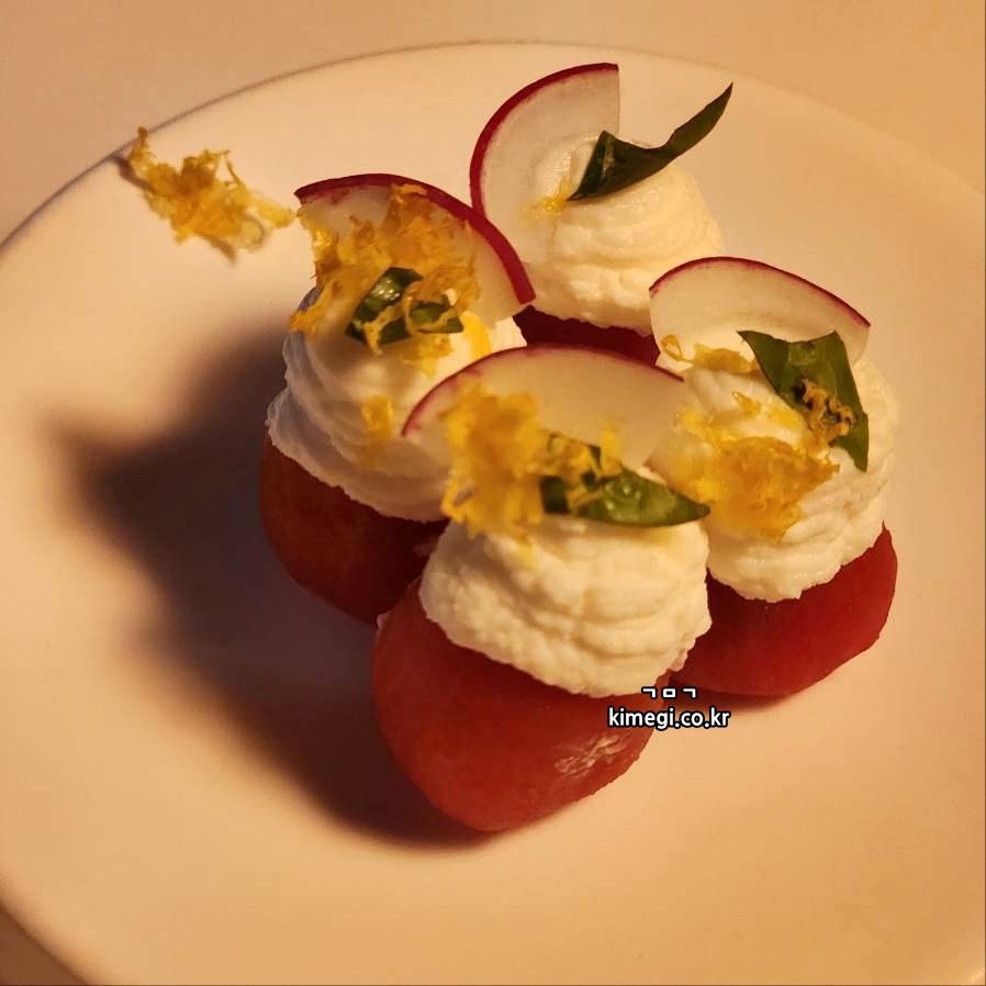 토마토 위에 크림치즈를 올린 디저트입니다. 고등어봉초밥이 나오고 디저트가 나왔는데 너무 맛있었습니다. 올리브에 숙성한 토마토인지? 잘 모르지만 만들기 쉬워보이면서 맛있는 것 같아요.