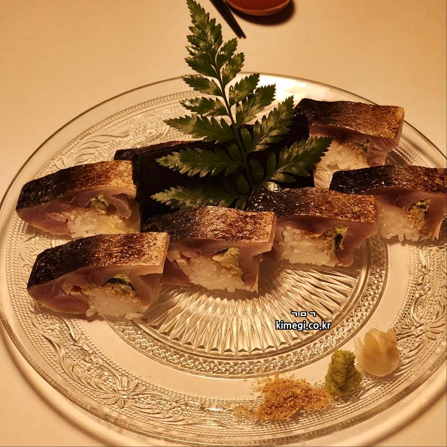 미리 주문을 해놔서 그런지 고등어봉초밥(28,000원)이 가장 먼저 나왔습니다. 8피스가 나오는데 잘 숙성시킨 고등어가 올라갔습니다. 고등어 사이에는 고추냉이와 생각이 들어있는데 너무 잘 어울립니다.